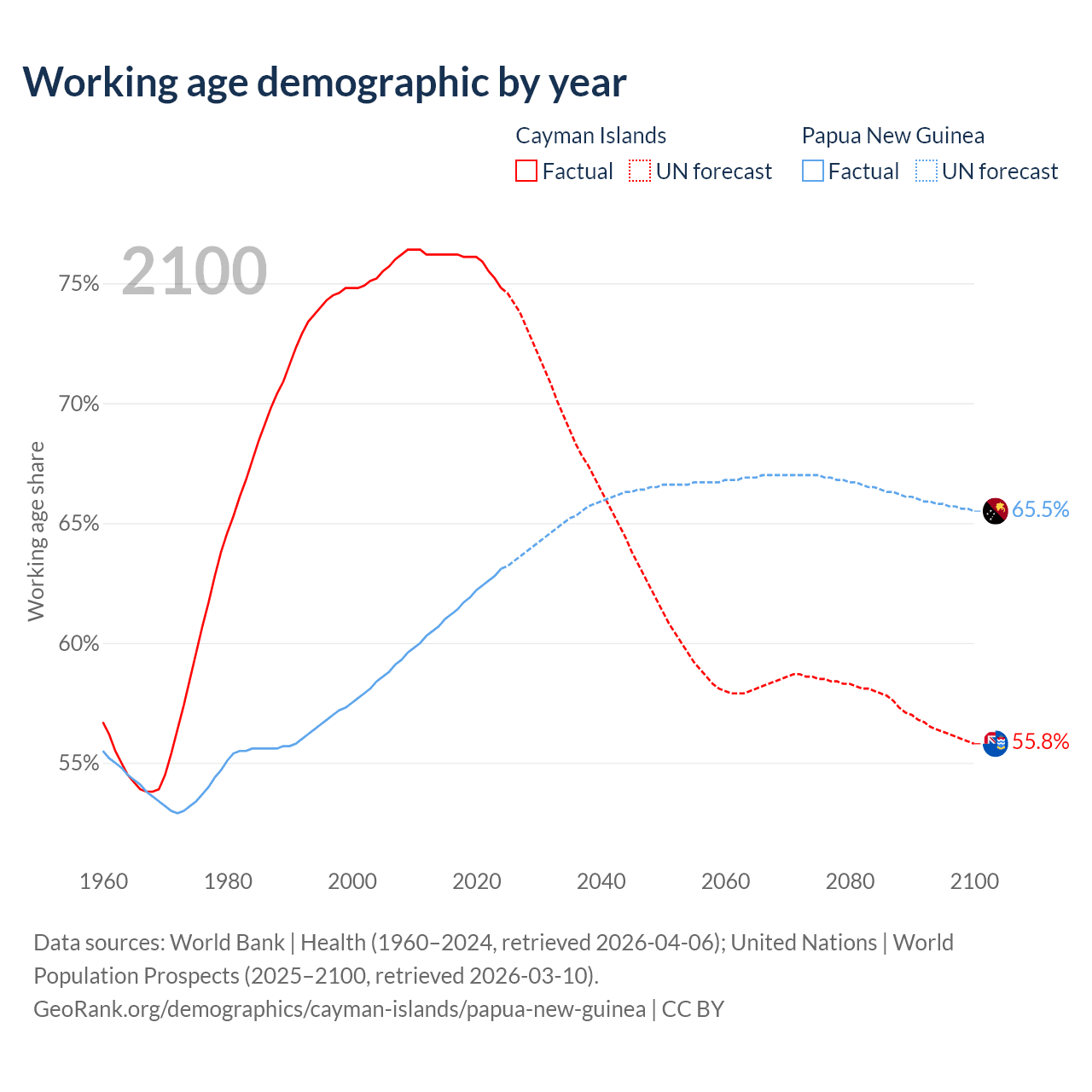 - The Cayman Islands has 58.1K working age adults (aged 15-64) vs 6.94M in Papua New Guinea.