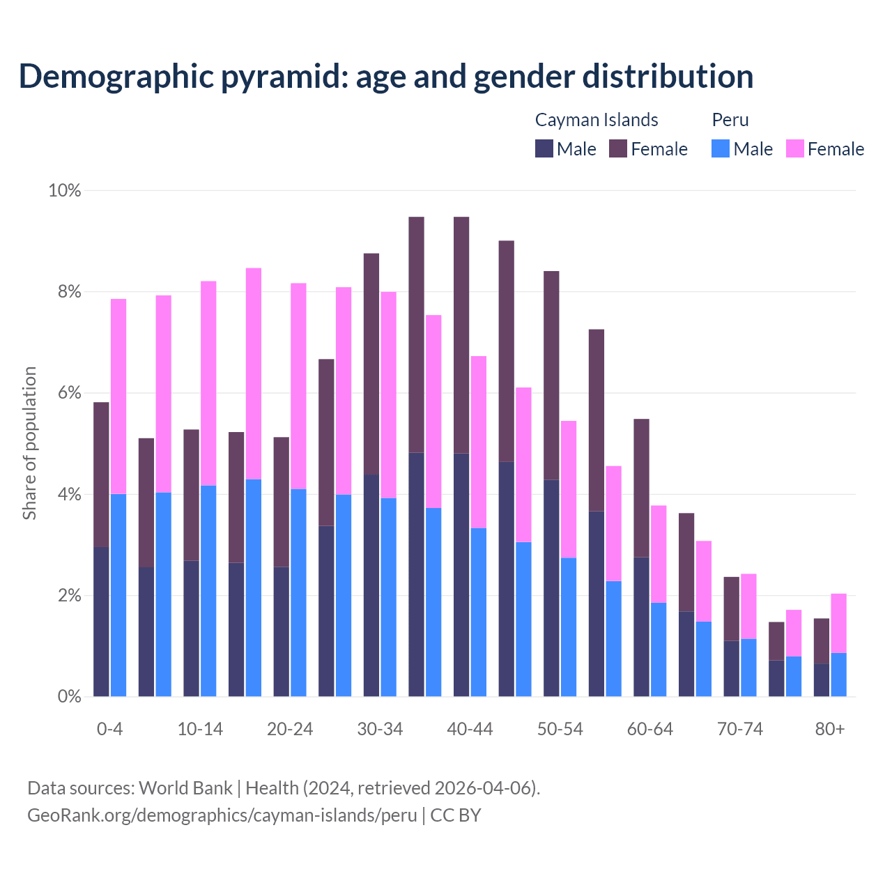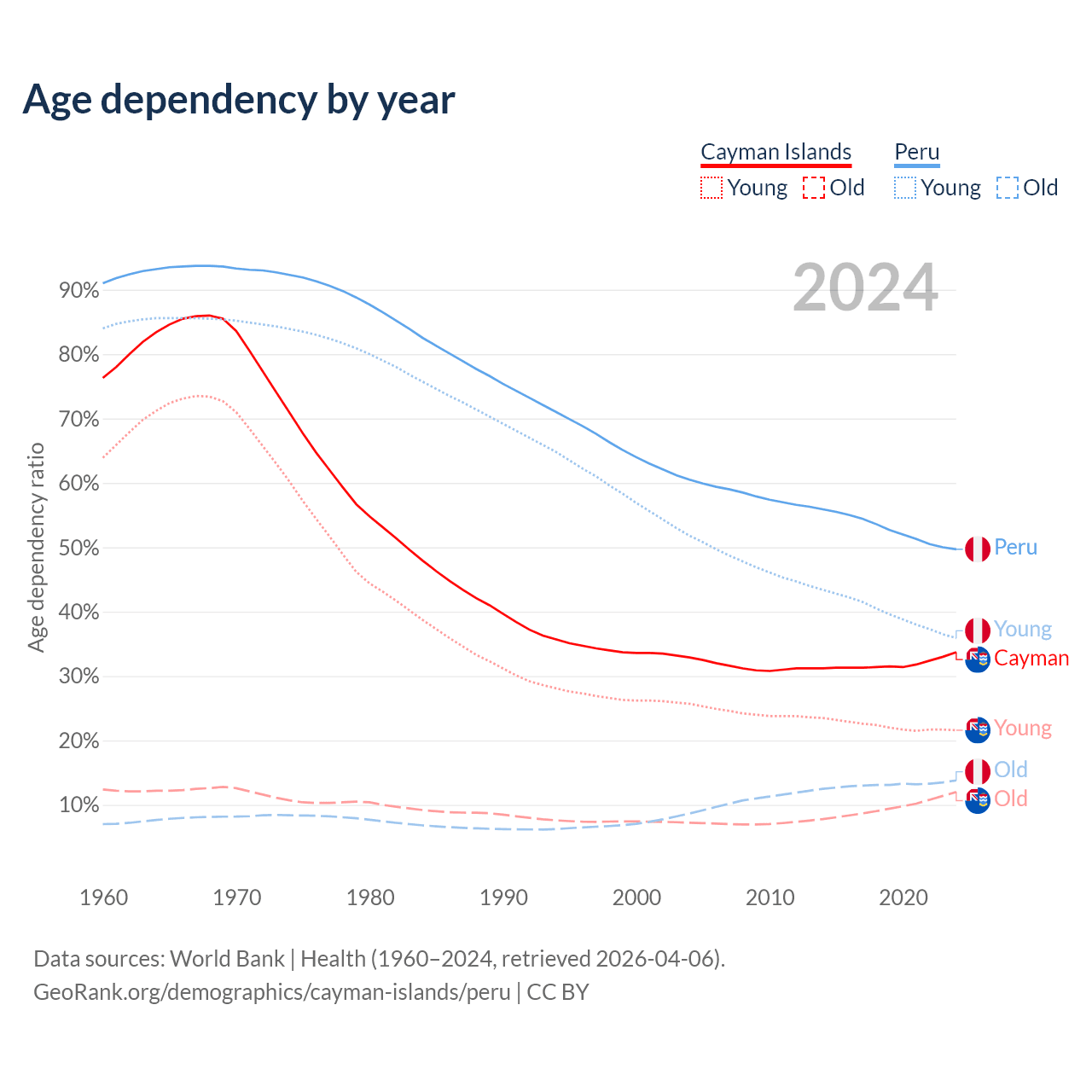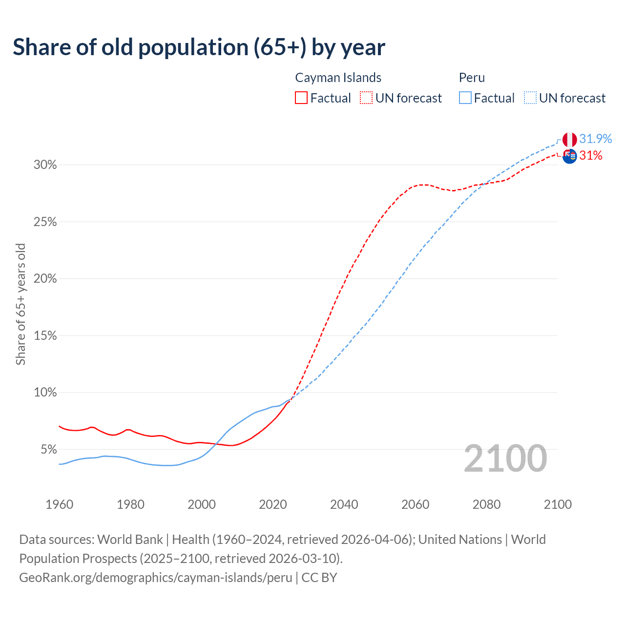 The share of older people aged 65 and over is 9% in the Cayman Islands and 9.23% in Peru. Life expectancy in the Cayman Islands compared to Peru .