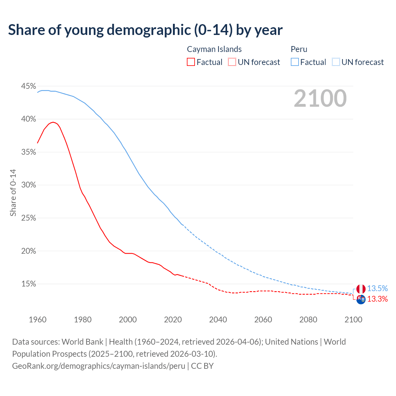 - The share of young demographic (0-15 years old) in the Cayman Islands is 16.2% vs 24% in Peru.