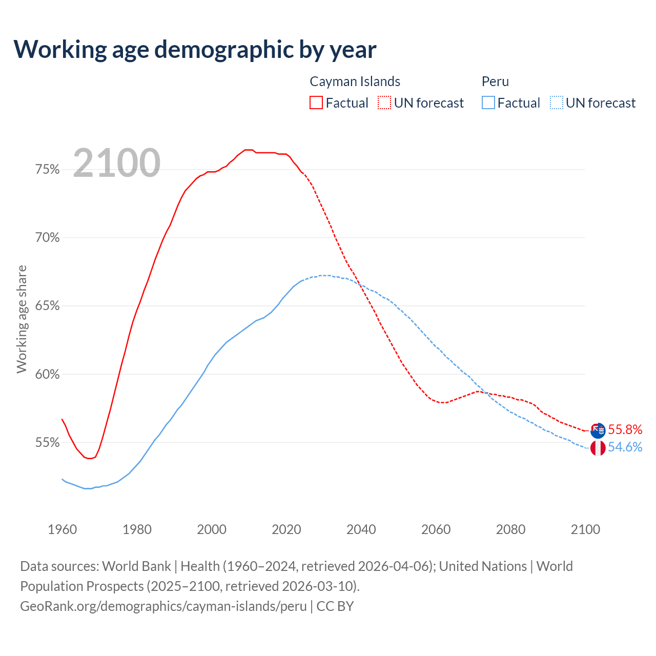 - The Cayman Islands has 58.1K working age adults (aged 15-64) vs 23.4M in Peru.