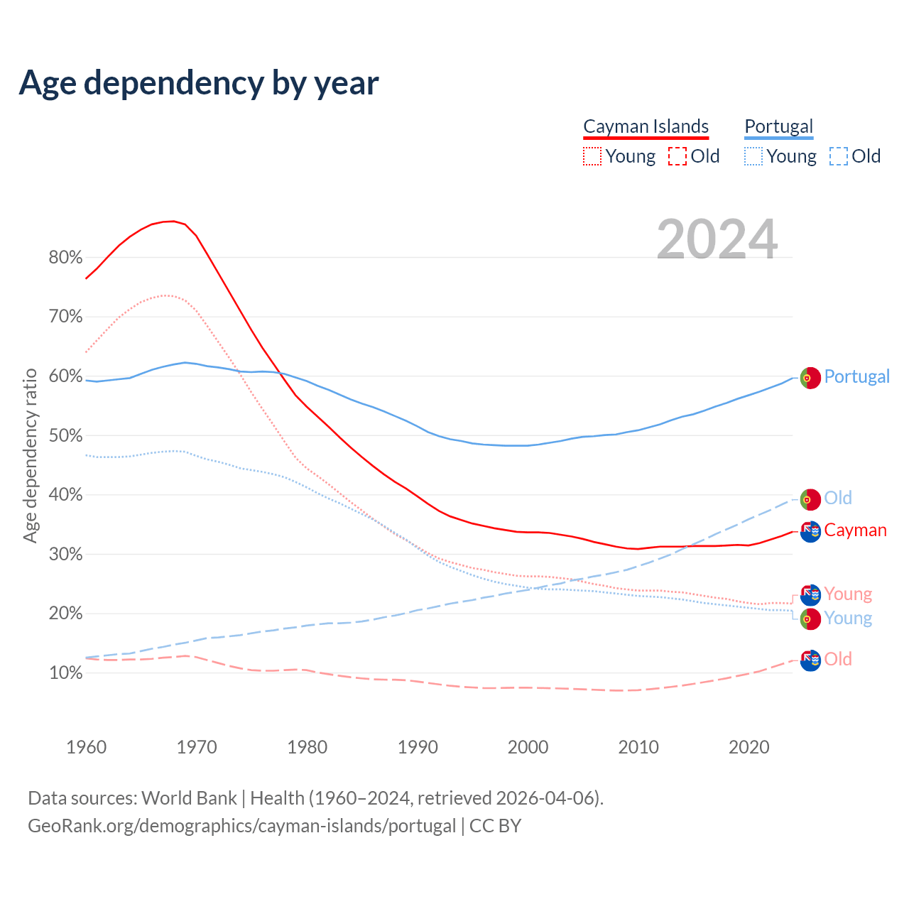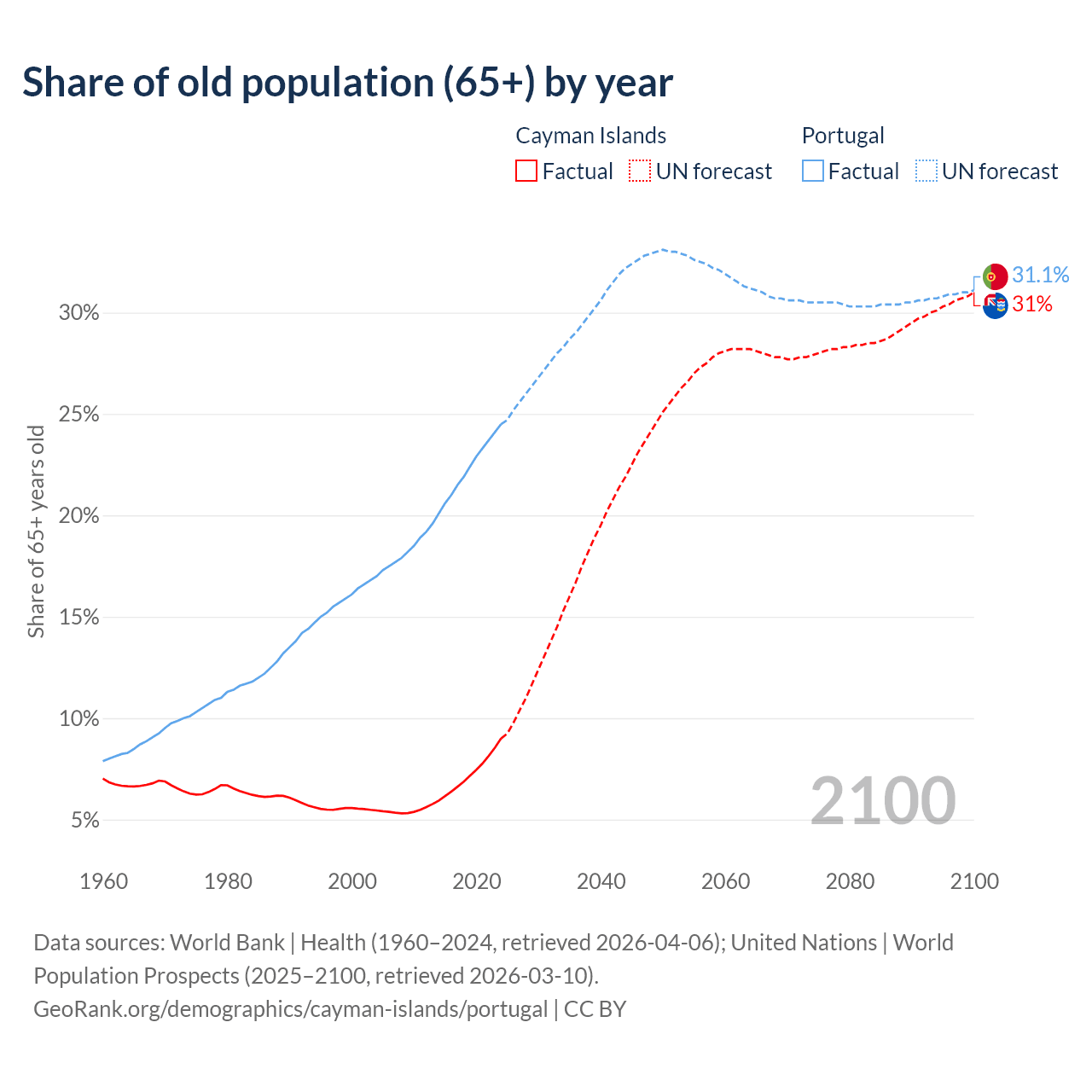 The share of older people aged 65 and over is 9% in the Cayman Islands and 24.5% in Portugal. Life expectancy in the Cayman Islands compared to Portugal .