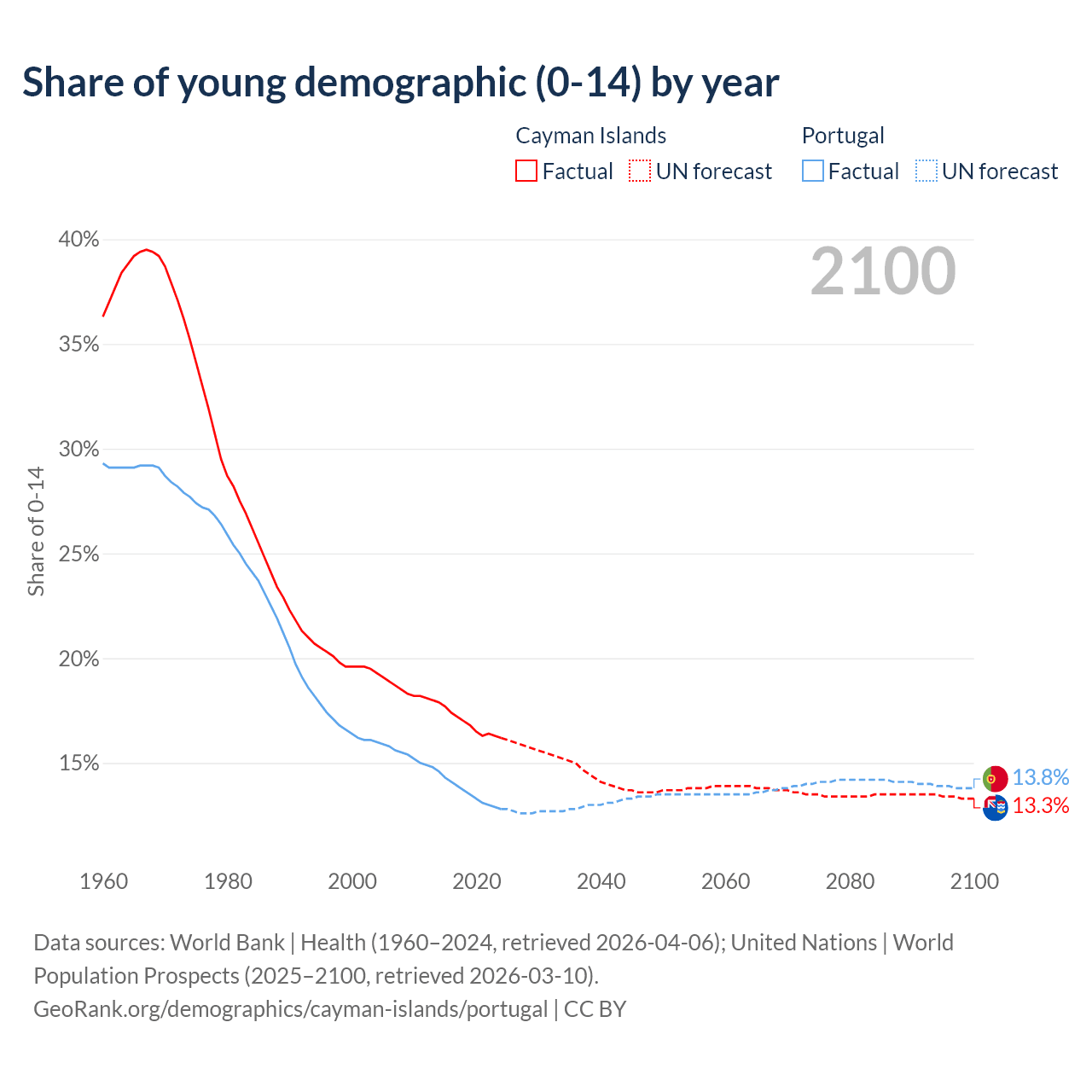 - The share of young demographic (0-15 years old) in the Cayman Islands is 16.2% vs 12.8% in Portugal.