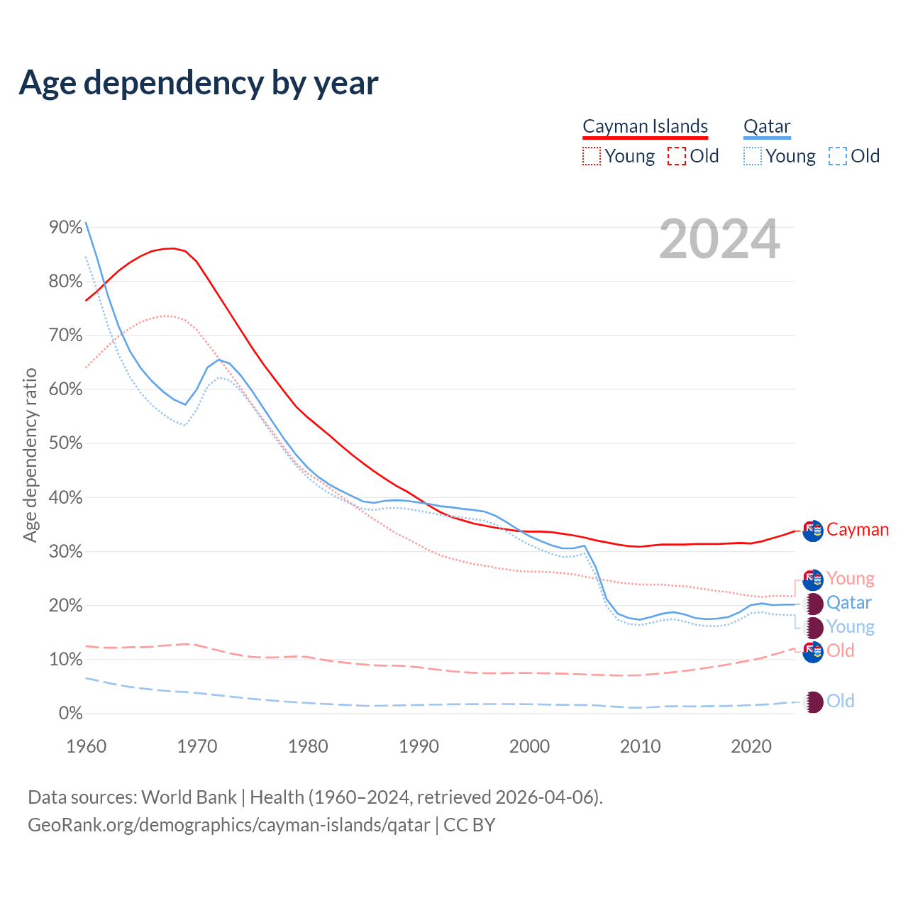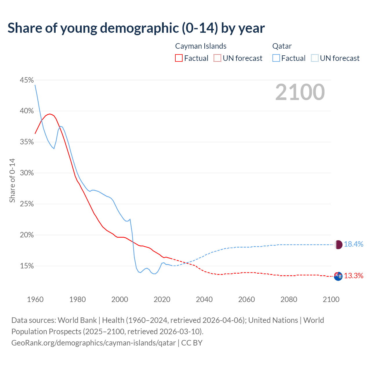 - The share of young demographic (0-15 years old) in the Cayman Islands is 16.2% vs 15.1% in Qatar.