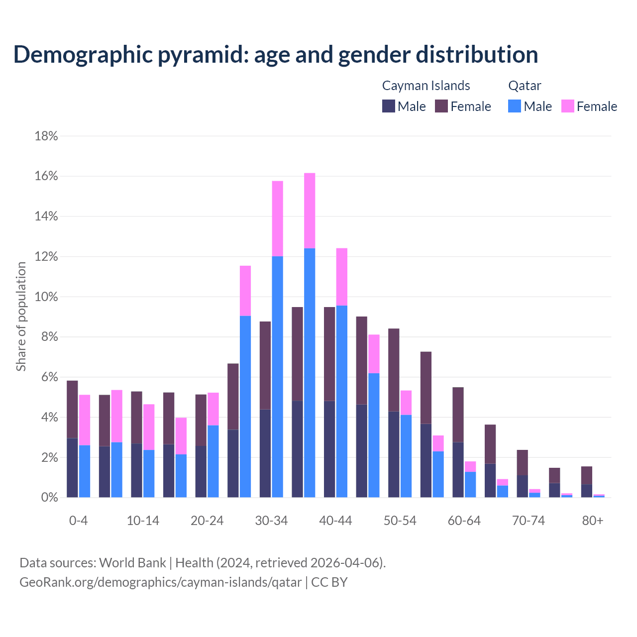 - The Cayman Islands is ranked 51/196 by median age (oldest to youngest) vs 78/196 for Qatar.