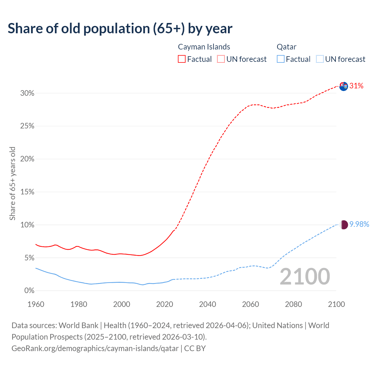 The share of older people aged 65 and over is 9% in the Cayman Islands and 1.68% in Qatar. Life expectancy in the Cayman Islands compared to Qatar .