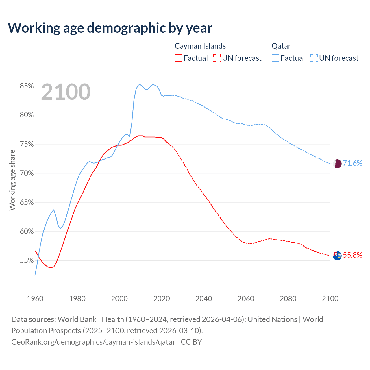 - The Cayman Islands has 58.1K working age adults (aged 15-64) vs 2.5M in Qatar.