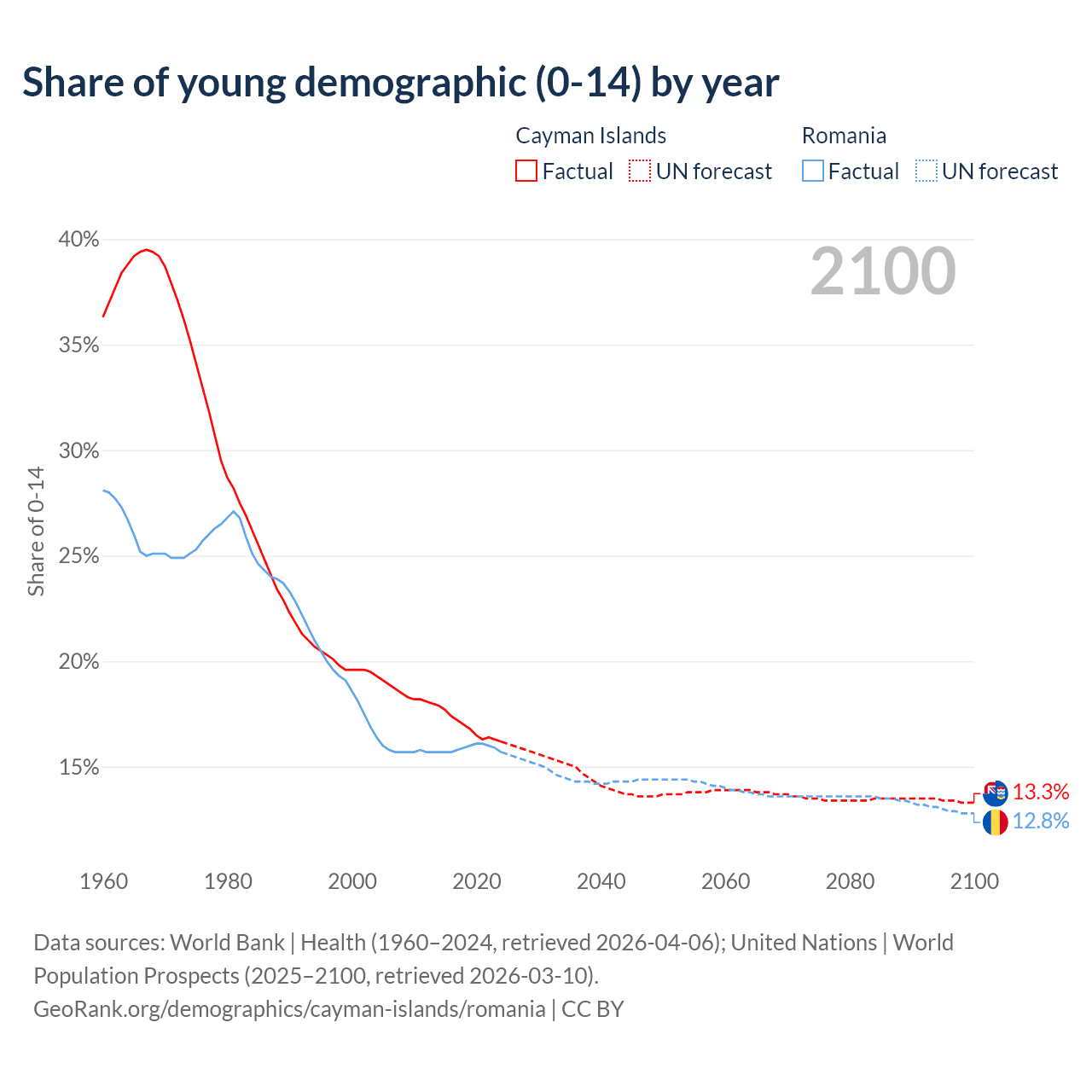 - The share of young demographic (0-15 years old) in the Cayman Islands is 16.2% vs 15.7% in Romania.