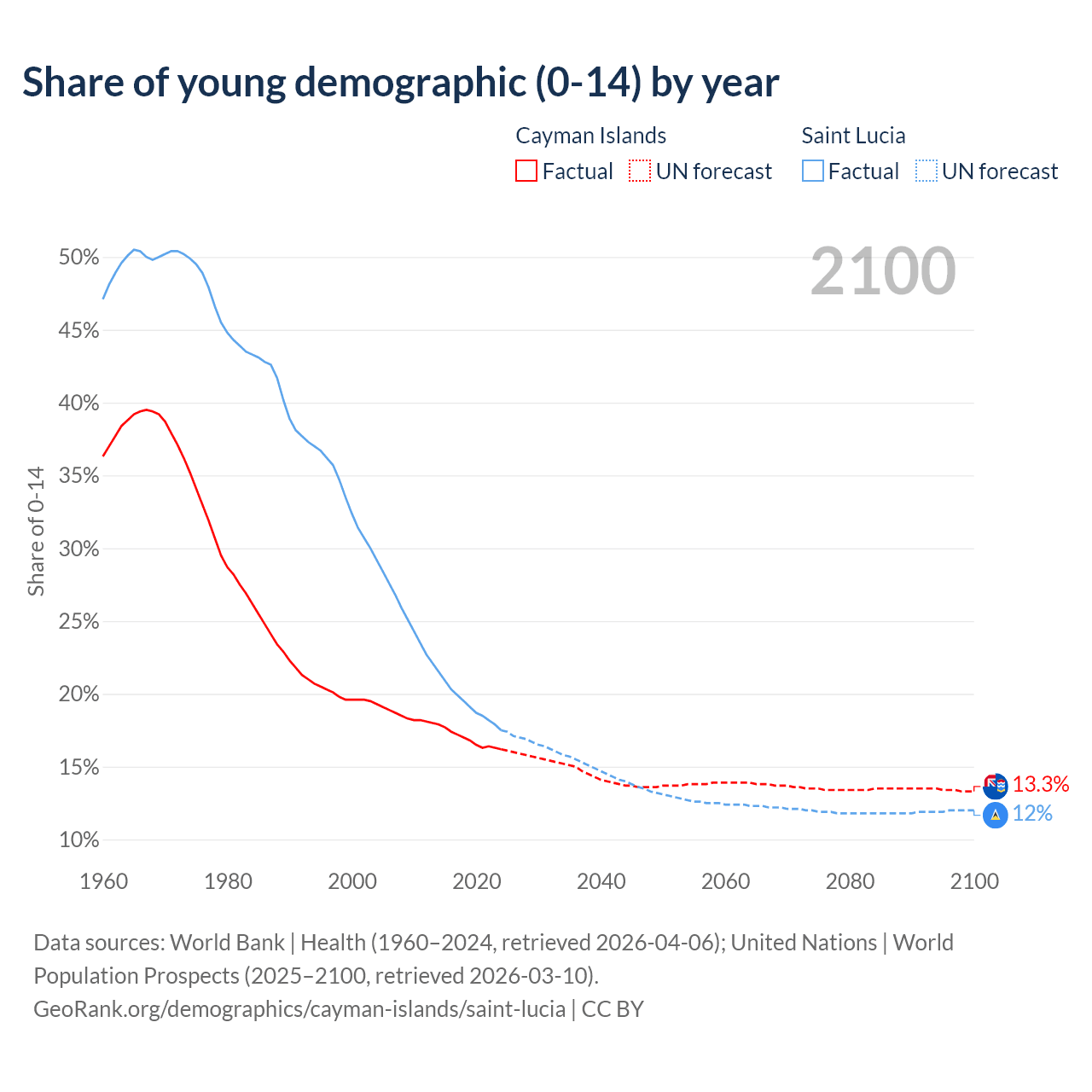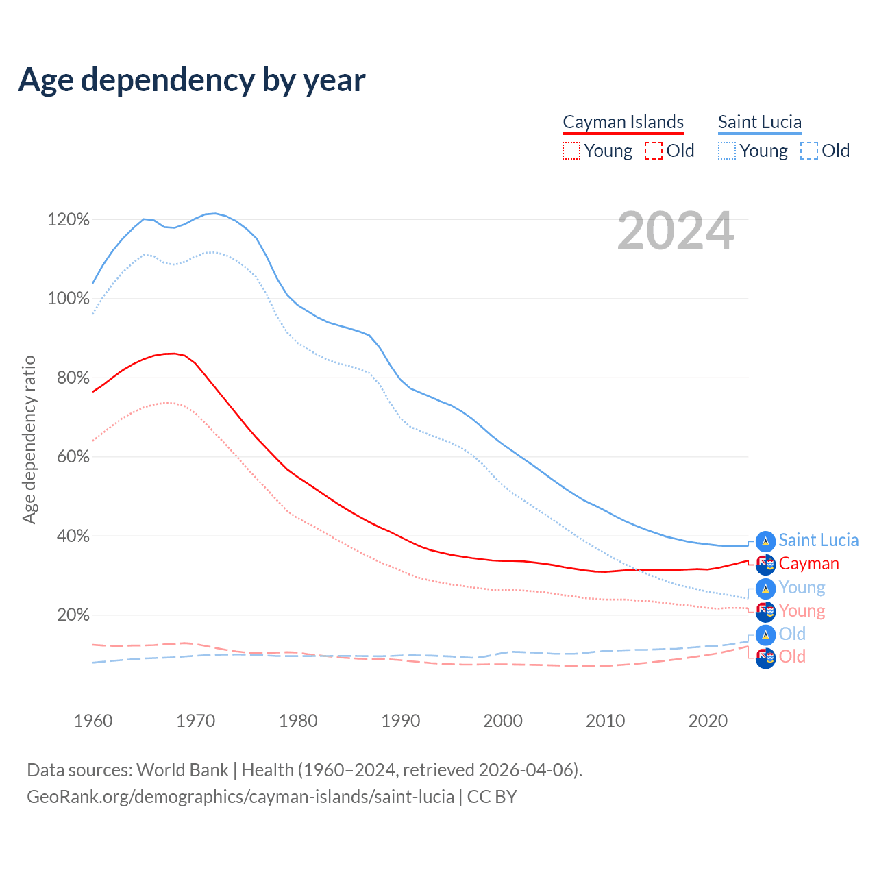 - The share of young demographic (0-15 years old) in the Cayman Islands is 16.2% vs 17.5% in Saint Lucia.