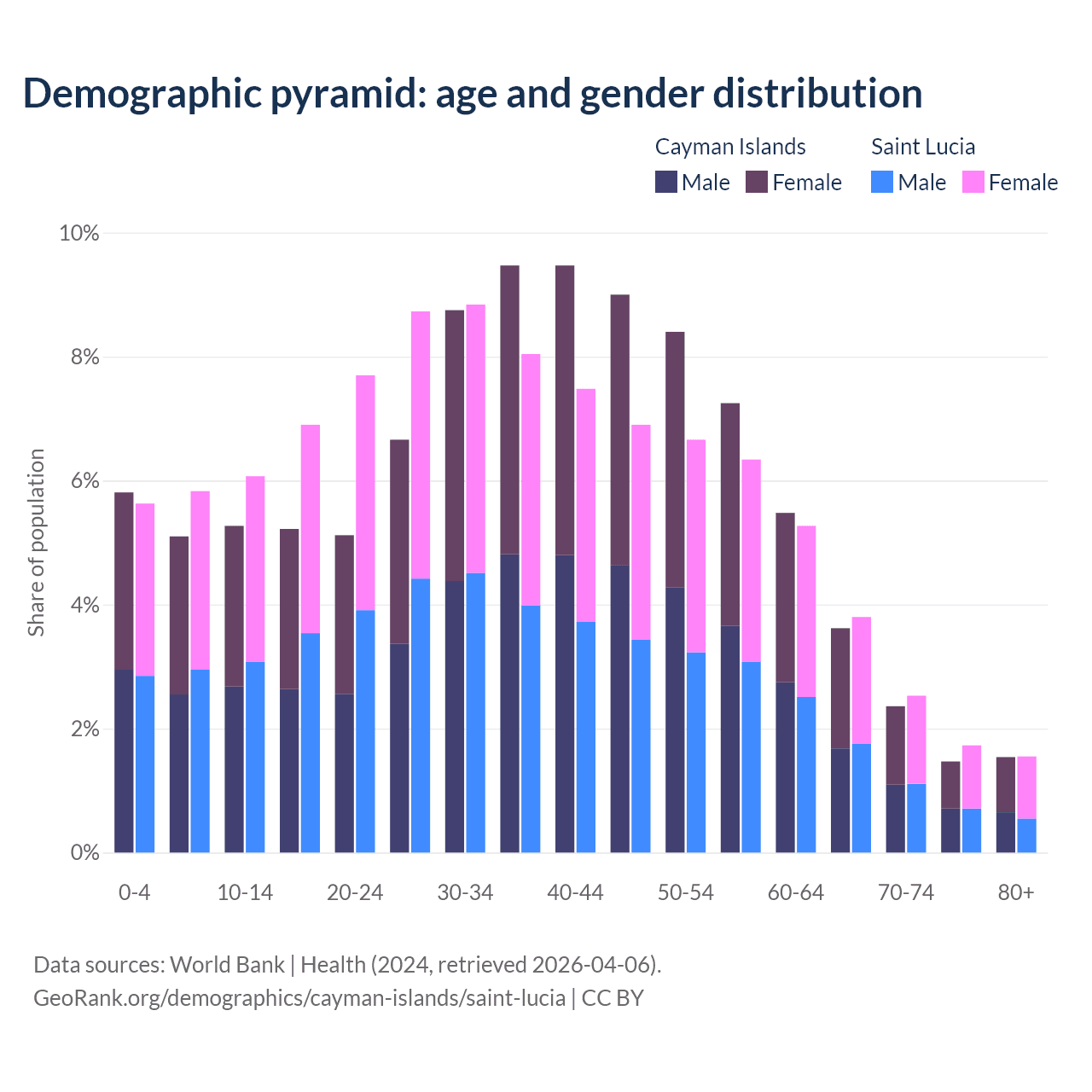 - The Cayman Islands is ranked 51/196 by median age (oldest to youngest) vs 74/196 for Saint Lucia.