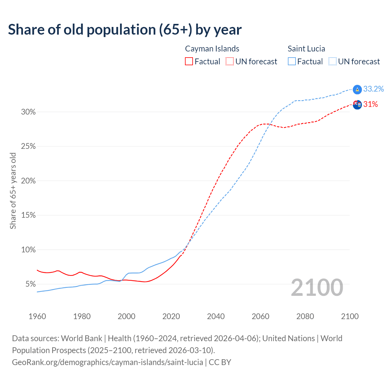 - The share of old-age demographic (65+) in the Cayman Islands is 9% vs 9.62% in Saint Lucia.