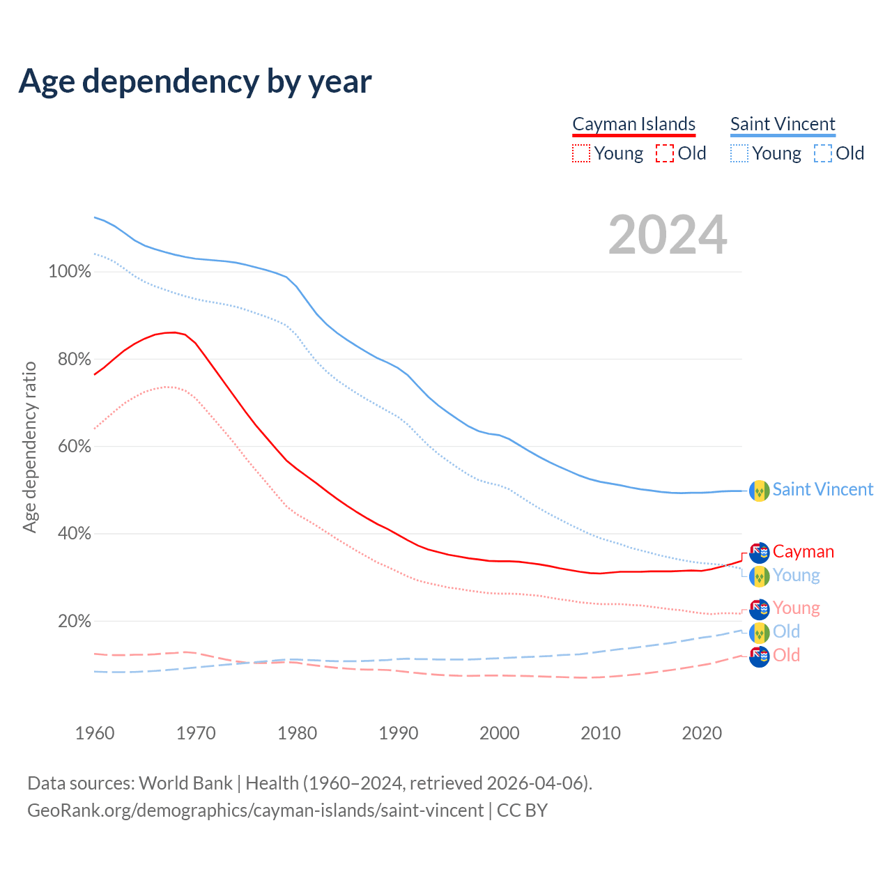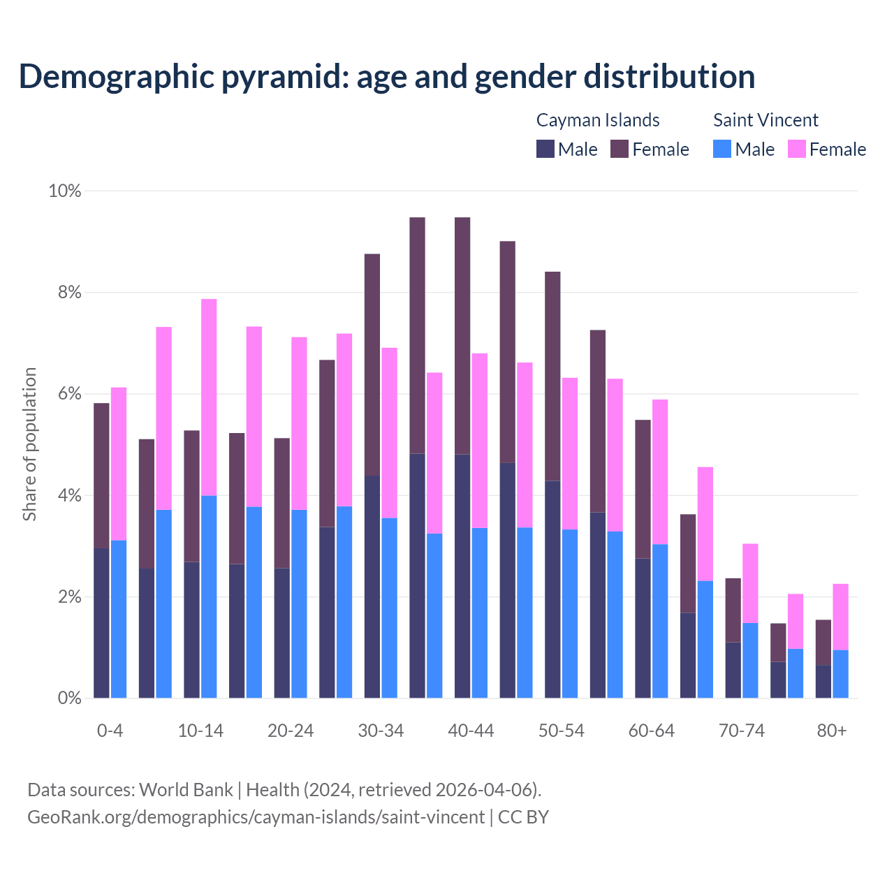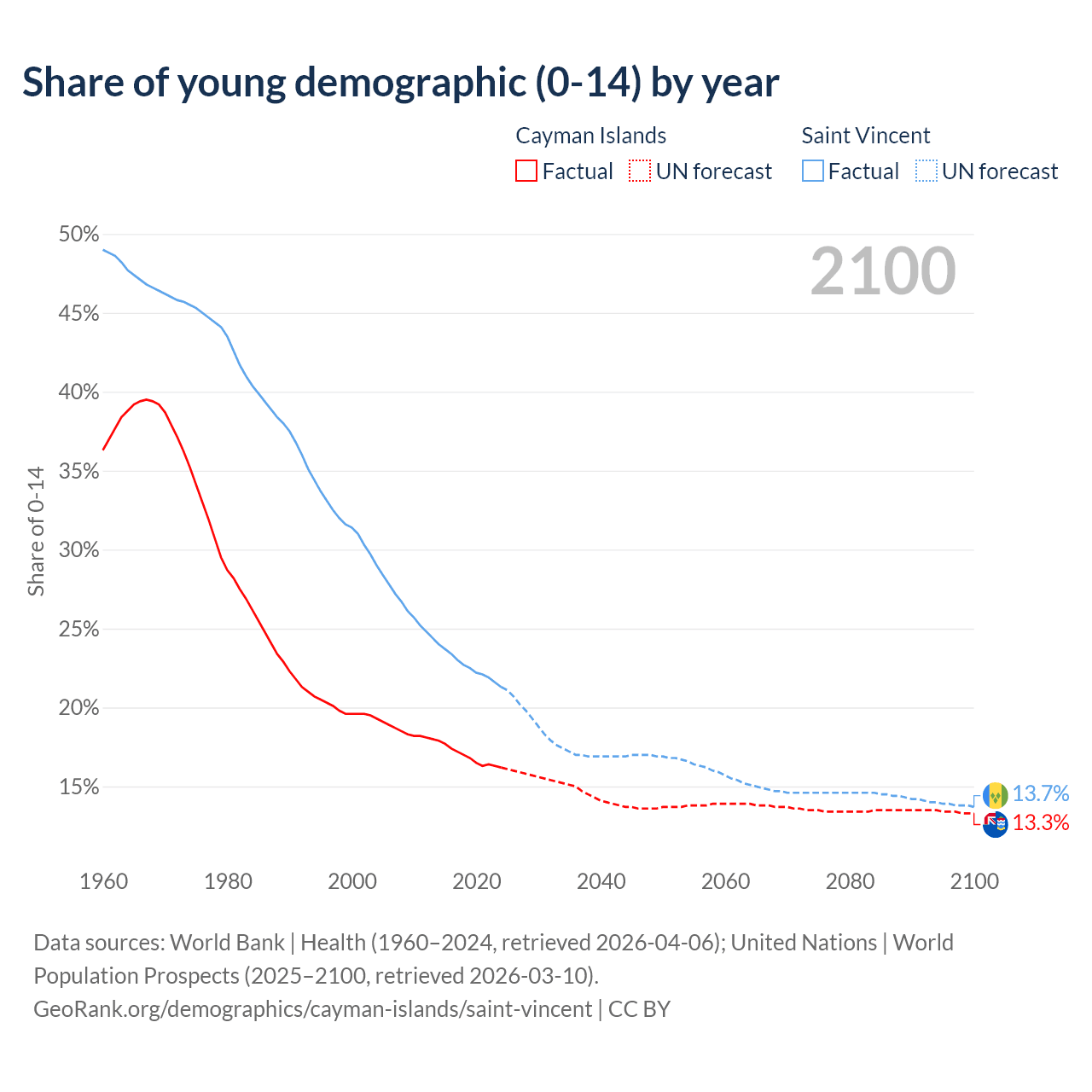 - The share of young demographic (0-15 years old) in the Cayman Islands is 16.2% vs 21.3% in Saint Vincent.