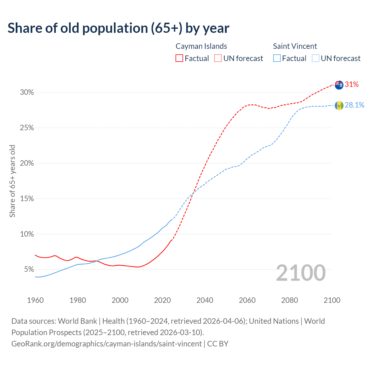 The share of older people aged 65 and over is 9% in the Cayman Islands and 11.9% in Saint Vincent. Life expectancy in the Cayman Islands compared to Saint Vincent .