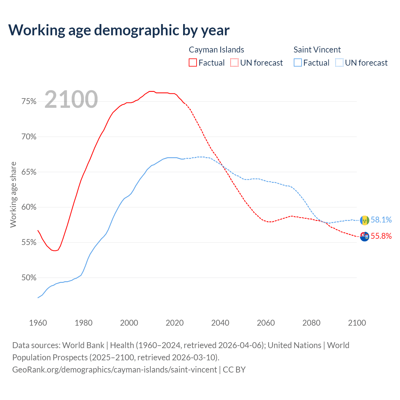 - The Cayman Islands has 58.1K working age adults (aged 15-64) vs 66.3K in Saint Vincent.