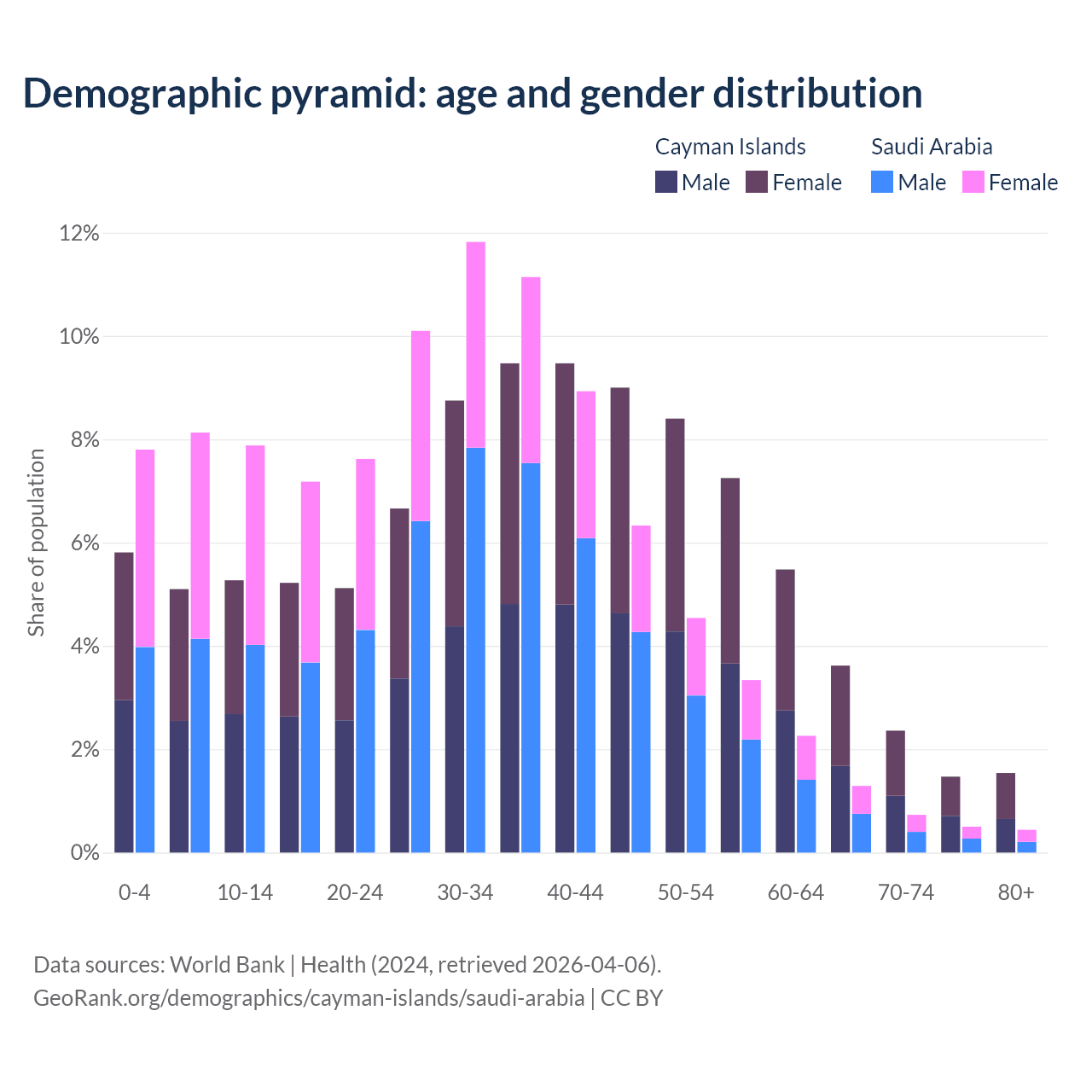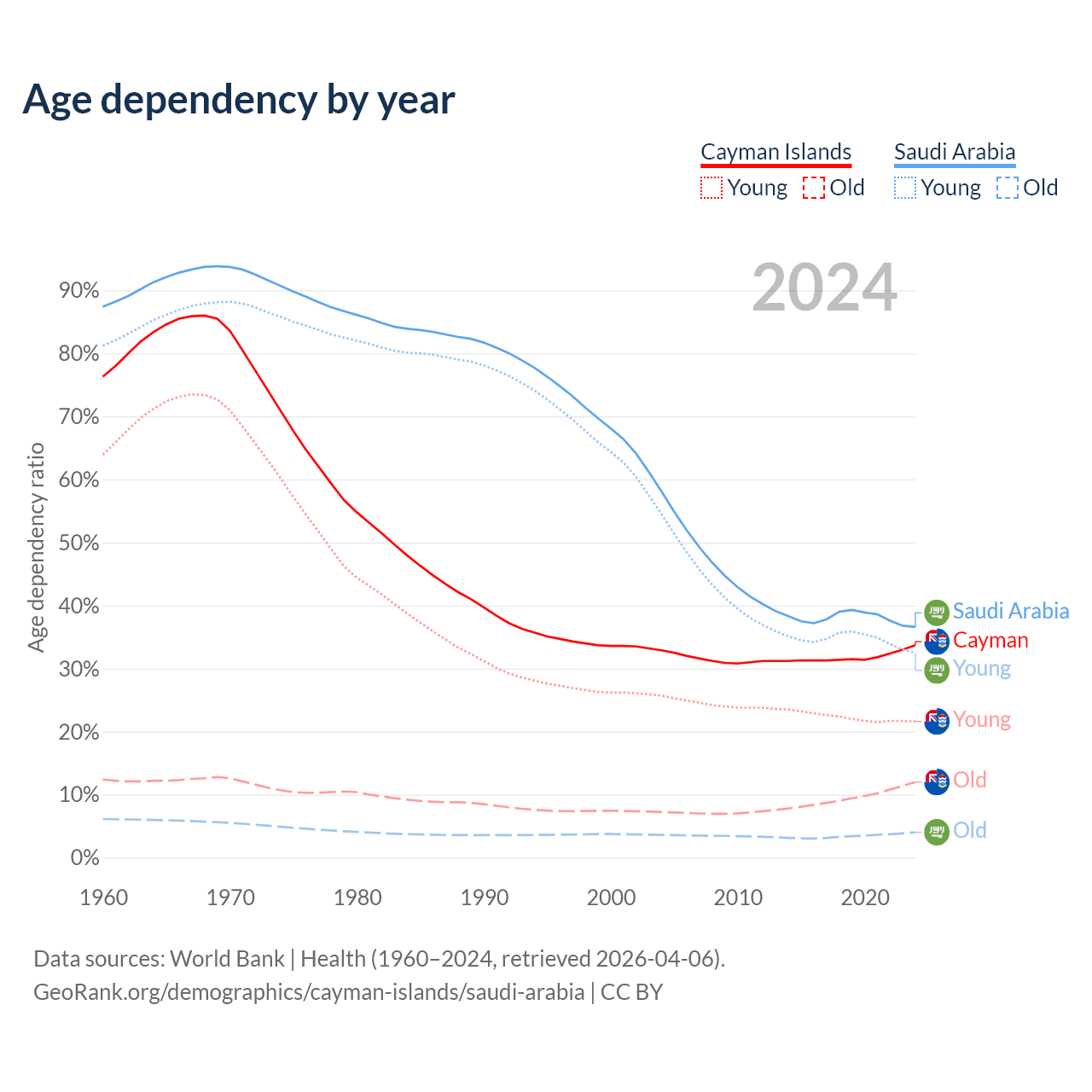 - The Cayman Islands is ranked 51/196 by median age (oldest to youngest) vs 98/196 for Saudi Arabia.