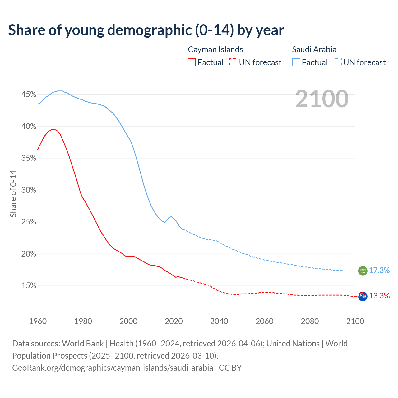 - The share of young demographic (0-15 years old) in the Cayman Islands is 16.2% vs 23.8% in Saudi Arabia.