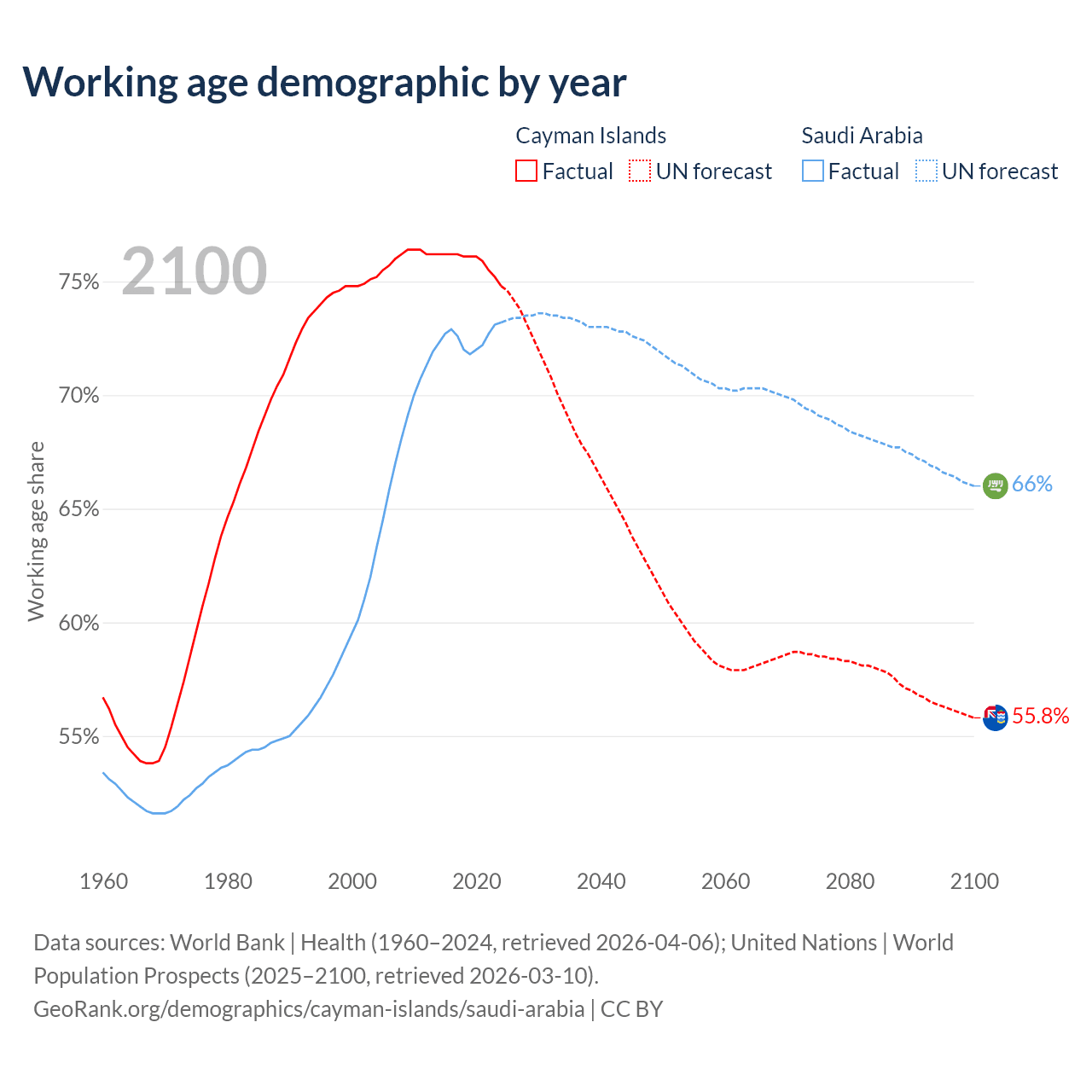 - The Cayman Islands has 58.1K working age adults (aged 15-64) vs 26.9M in Saudi Arabia.