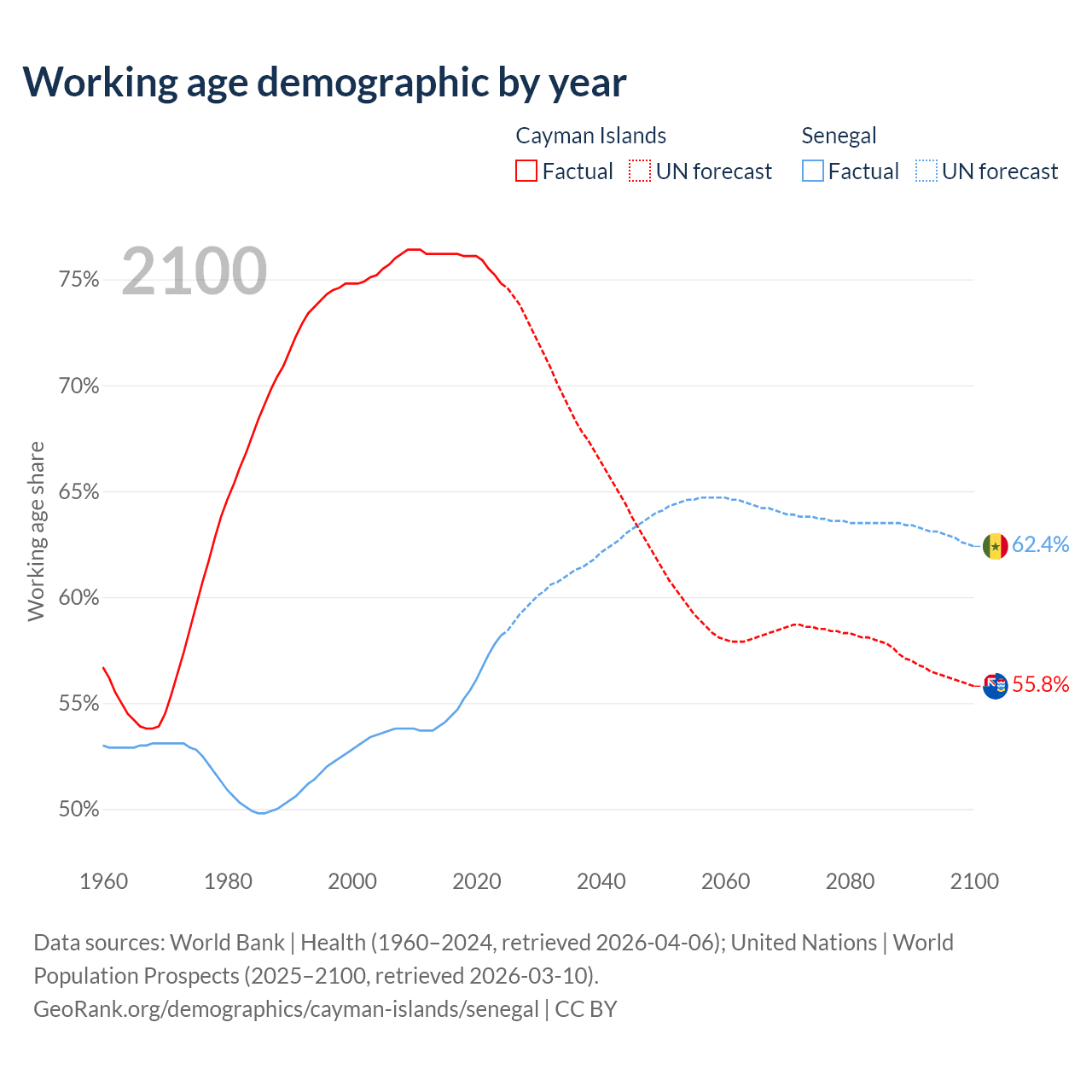 - The Cayman Islands has 58.1K working age adults (aged 15-64) vs 11.3M in Senegal.