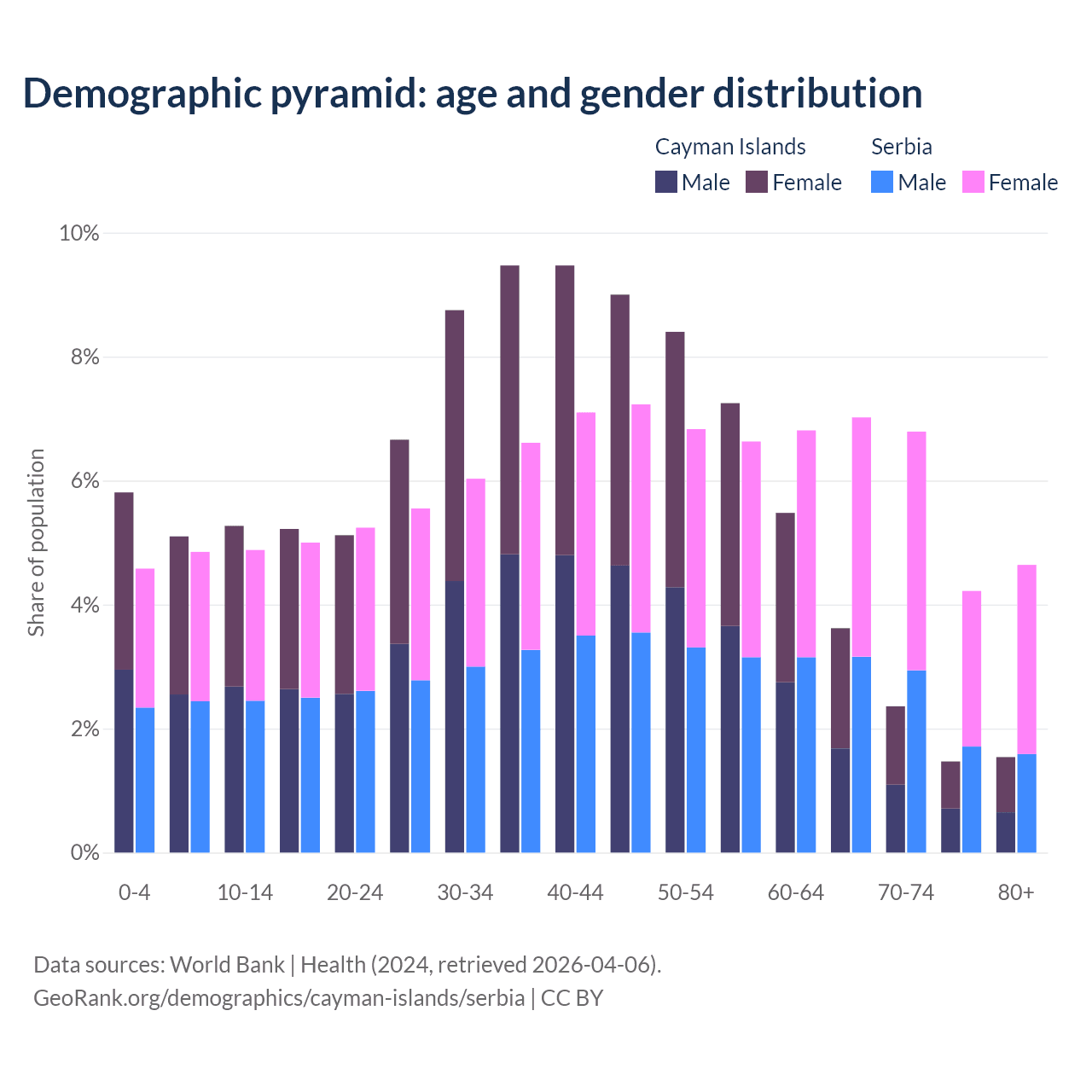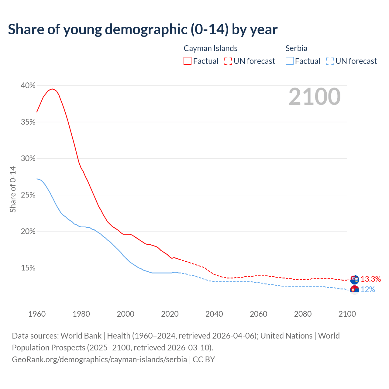 - The share of young demographic (0-15 years old) in the Cayman Islands is 16.2% vs 14.3% in Serbia.