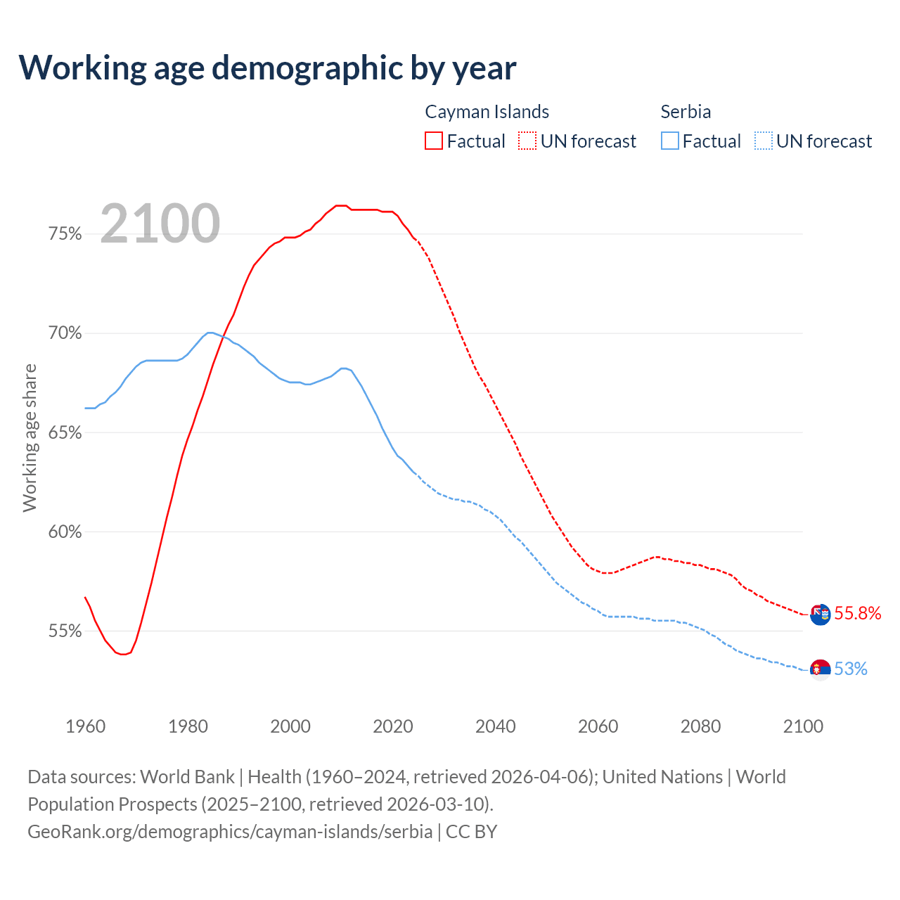 - The Cayman Islands has 58.1K working age adults (aged 15-64) vs 4.09M in Serbia.