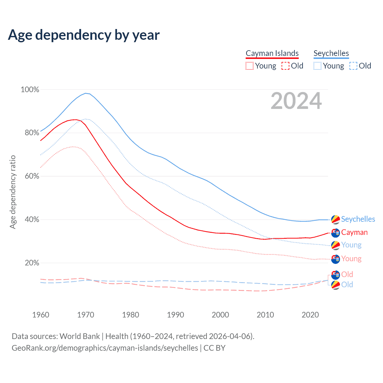 - The Cayman Islands is ranked 51/196 by median age (oldest to youngest) vs 76/196 for the Seychelles.