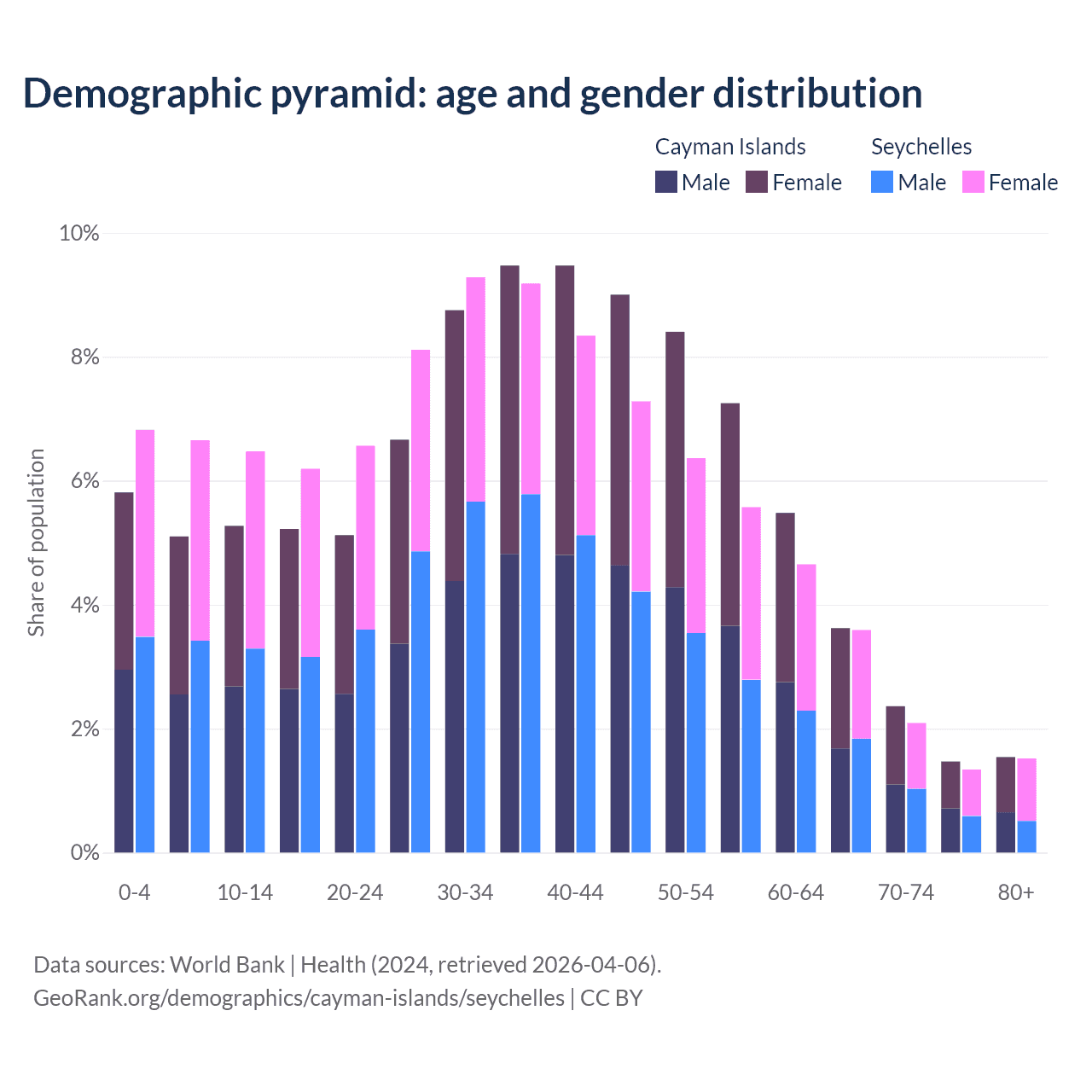 - As of 2026, the population of the Cayman Islands is 77.6K vs 126K in the Seychelles - 1.63 times difference.