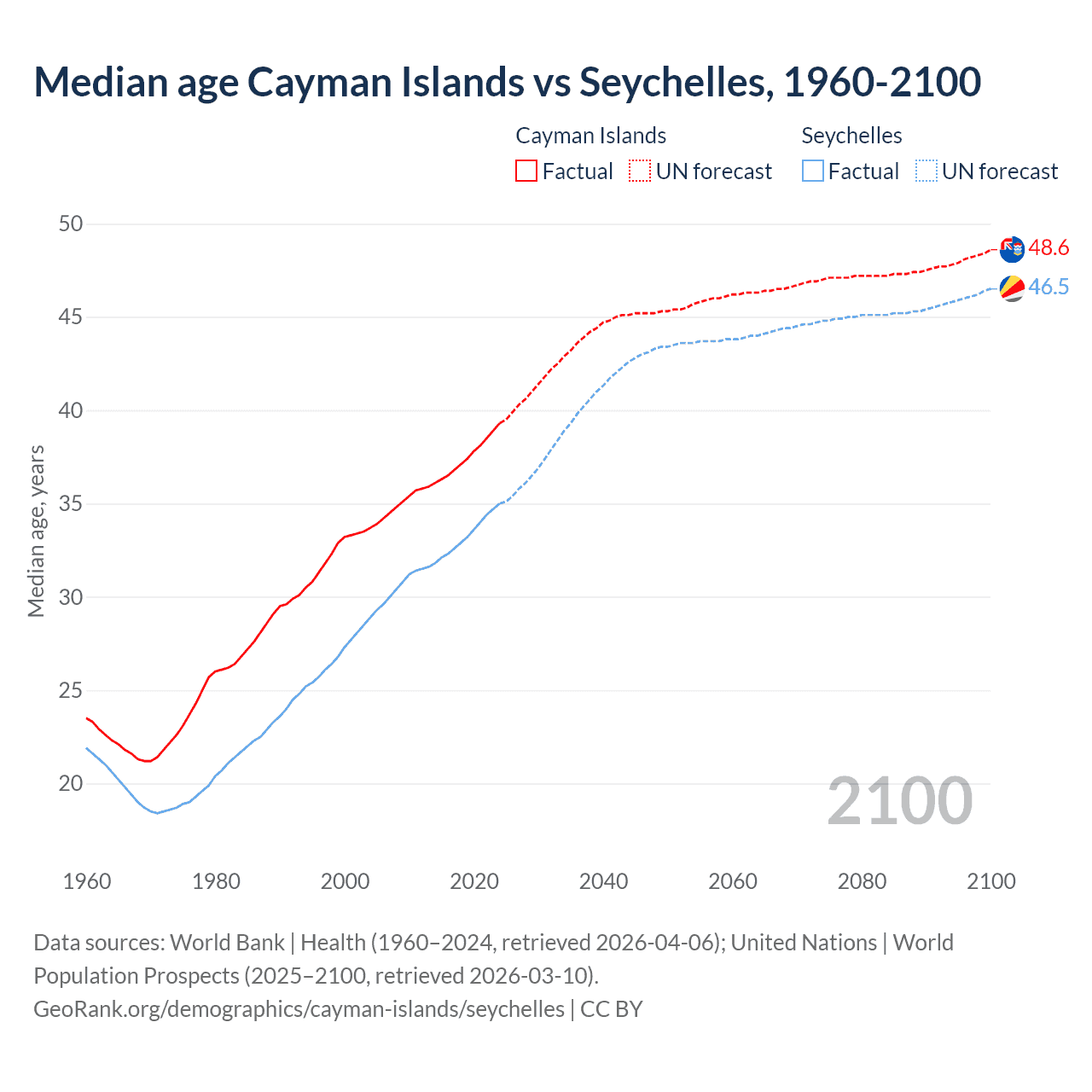 Median age Cayman Islands vs Seychelles, 1960-2100