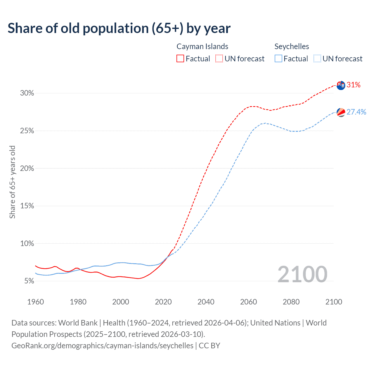 The share of older people aged 65 and over is 9% in the Cayman Islands and 8.54% in the Seychelles. Life expectancy in the Cayman Islands compared to the Seychelles .
