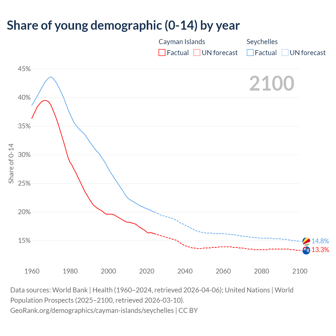 - The share of young demographic (0-15 years old) in the Cayman Islands is 16.2% vs 20% in the Seychelles.