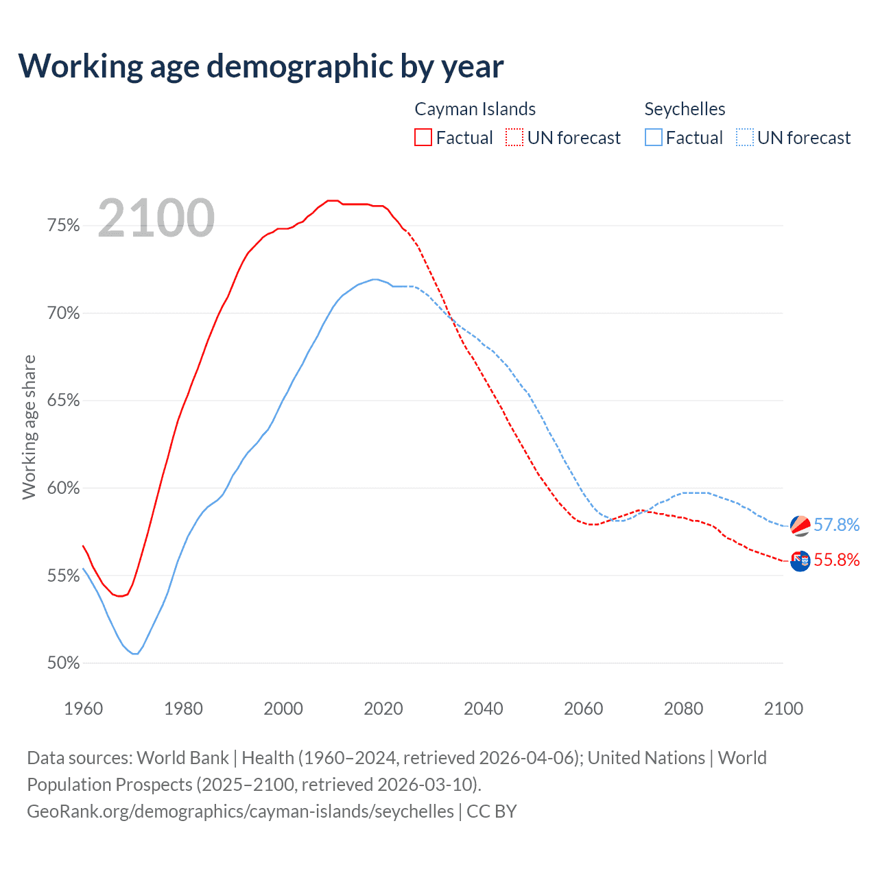- The Cayman Islands has 58.1K working age adults (aged 15-64) vs 90.3K in the Seychelles.