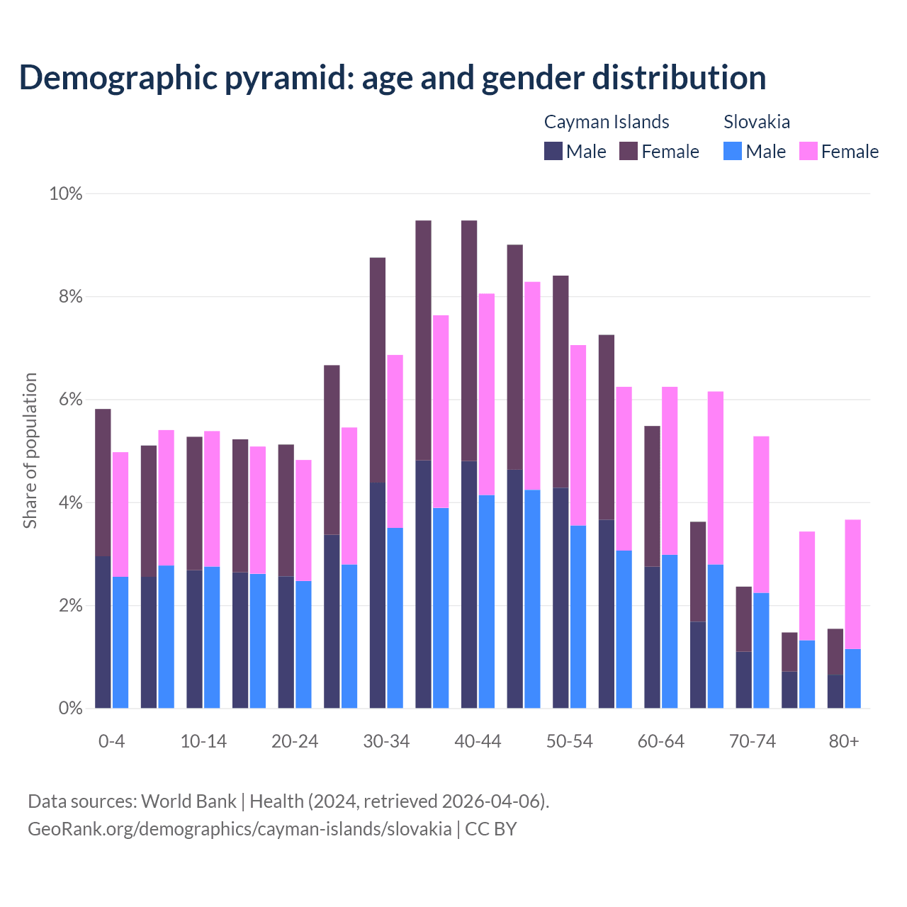 - As of 2026, the population of the Cayman Islands is 77.6K vs 5.36M in Slovakia - 69 times difference.