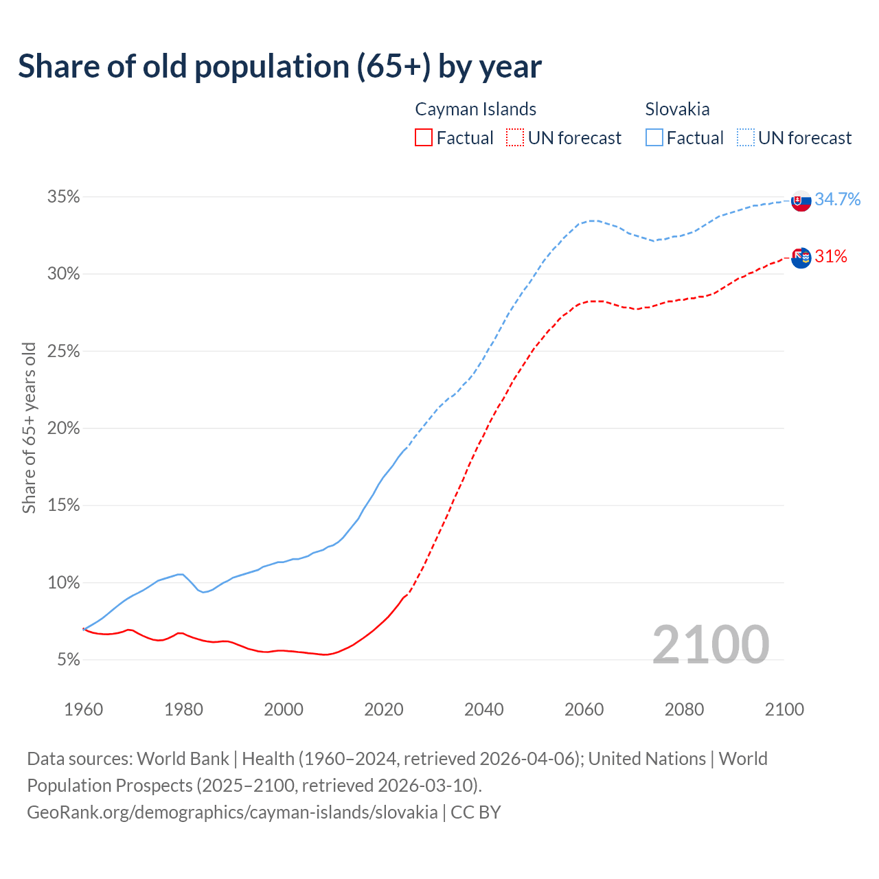 The share of older people aged 65 and over is 9% in the Cayman Islands and 18.5% in Slovakia. Life expectancy in the Cayman Islands compared to Slovakia .