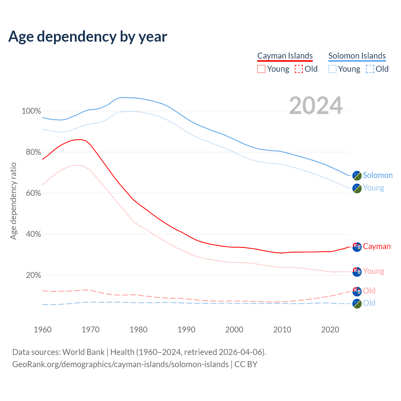 - The Cayman Islands is ranked 51/196 by median age (oldest to youngest) vs 153/196 for the Solomon Islands.