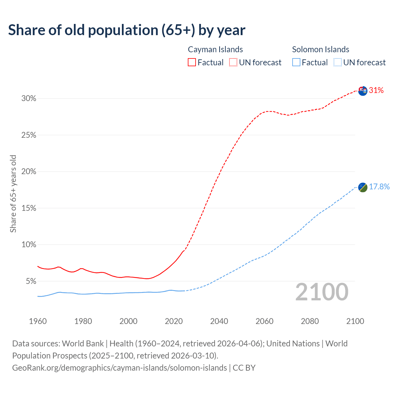 The share of older people aged 65 and over is 9% in the Cayman Islands and 3.64% in the Solomon Islands. Life expectancy in the Cayman Islands compared to the Solomon Islands .