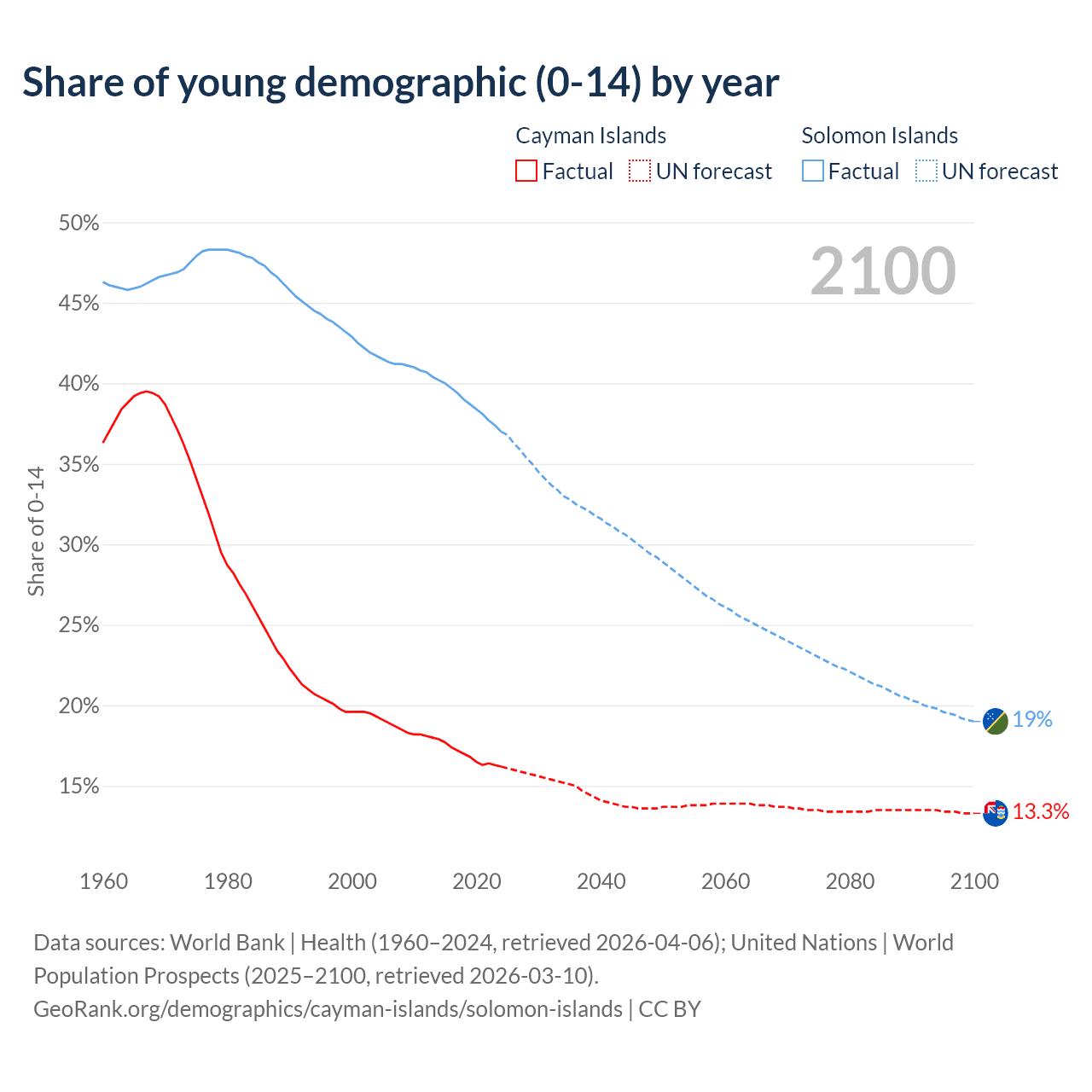 - The share of young demographic (0-15 years old) in the Cayman Islands is 16.2% vs 37% in the Solomon Islands.