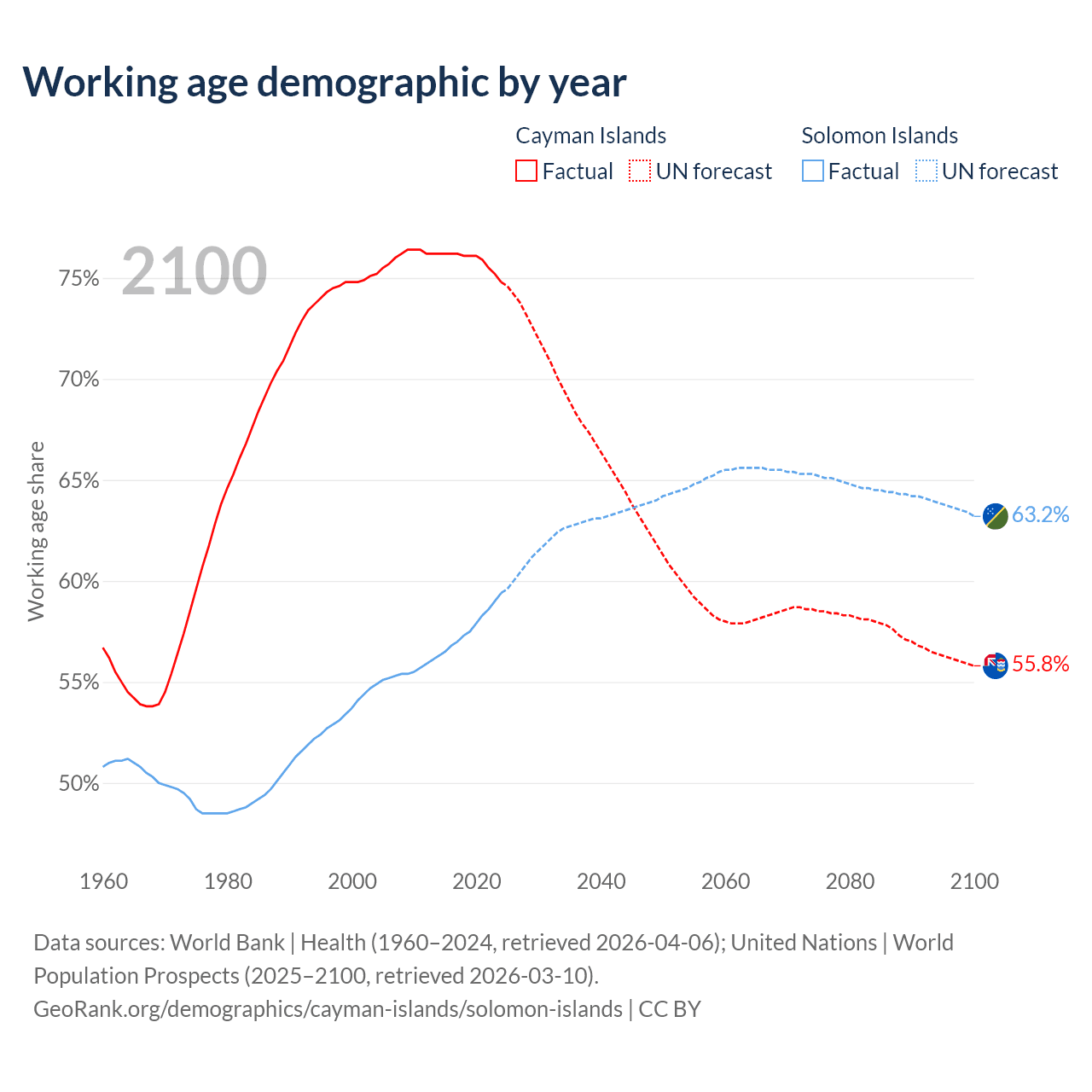 - The Cayman Islands has 58.1K working age adults (aged 15-64) vs 513K in the Solomon Islands.