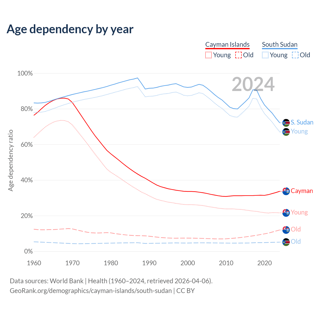 - The share of young demographic (0-15 years old) in the Cayman Islands is 16.2% vs 38.9% in South Sudan.