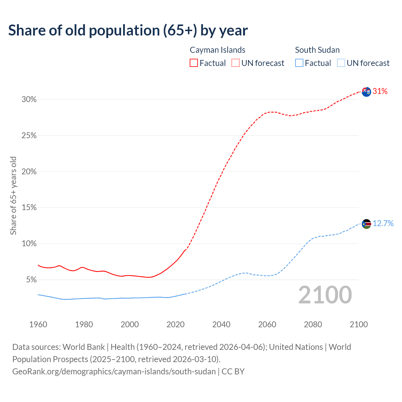 The share of older people aged 65 and over is 9% in the Cayman Islands and 2.99% in South Sudan. Life expectancy in the Cayman Islands compared to South Sudan .