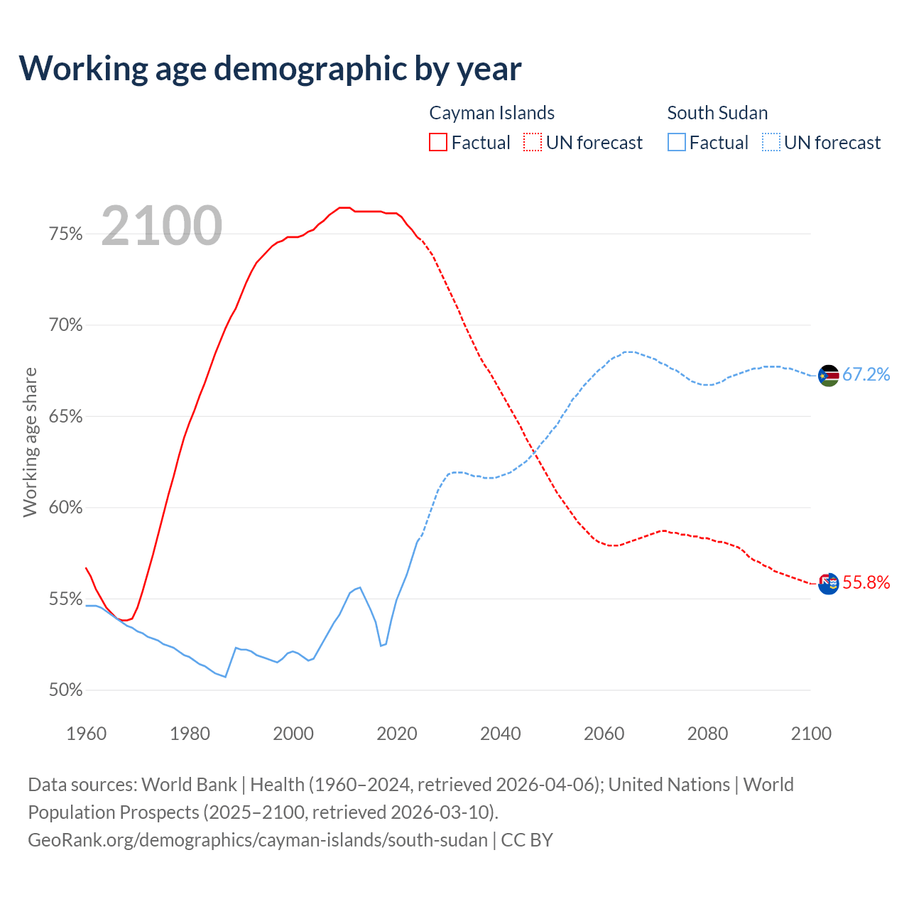 - The Cayman Islands has 58.1K working age adults (aged 15-64) vs 7.27M in South Sudan.