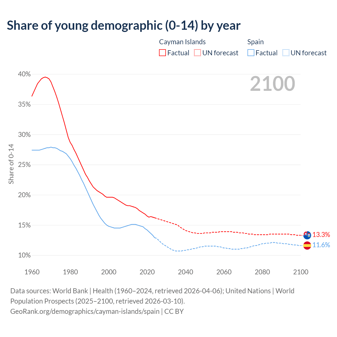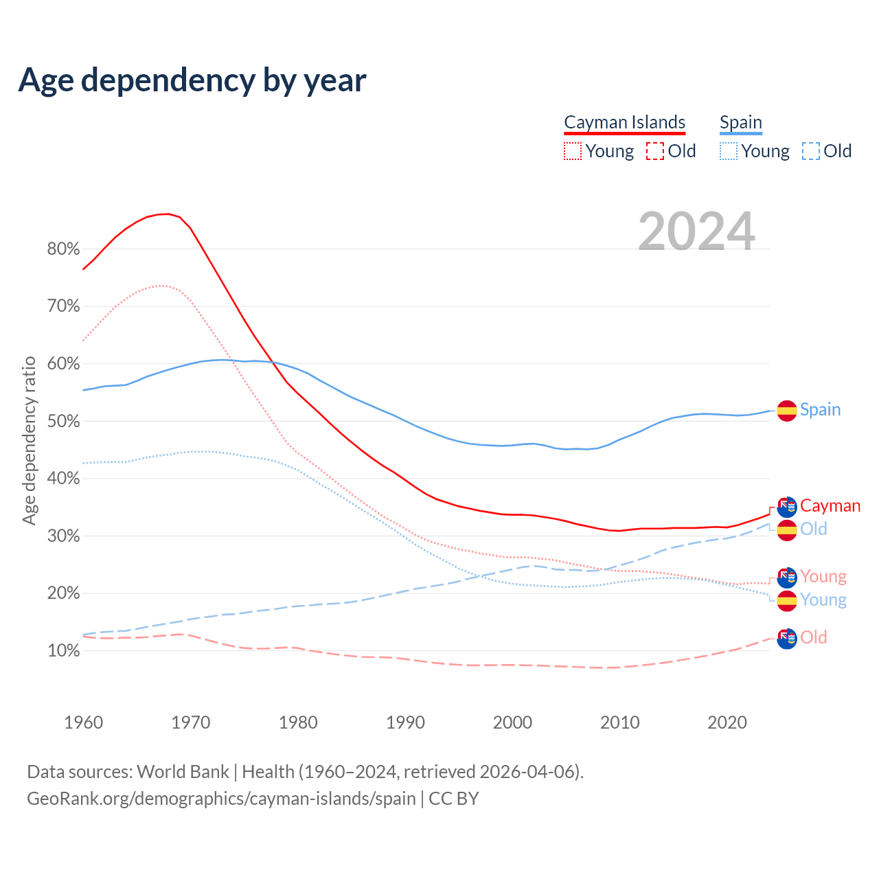- The share of young demographic (0-15 years old) in the Cayman Islands is 16.2% vs 12.9% in Spain.