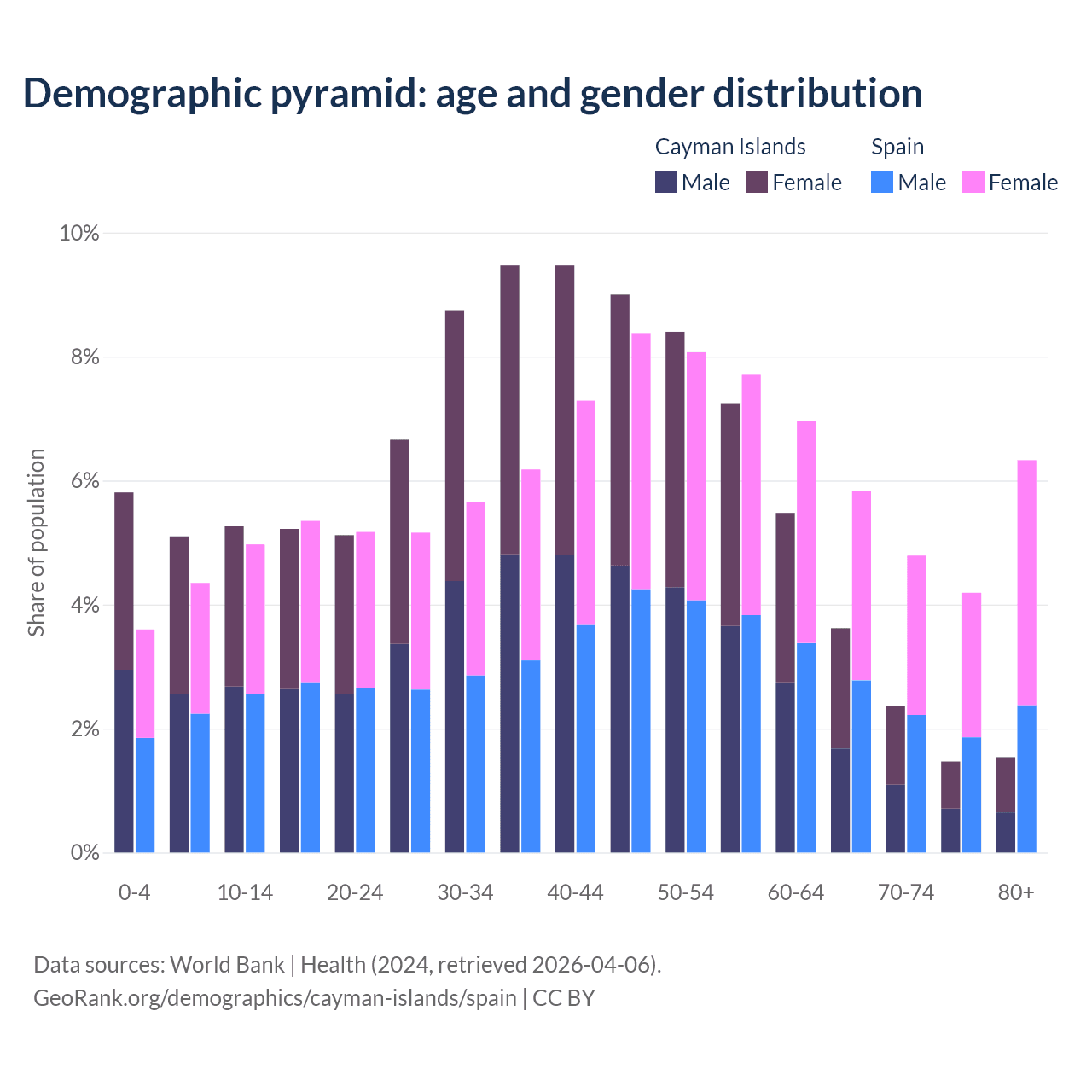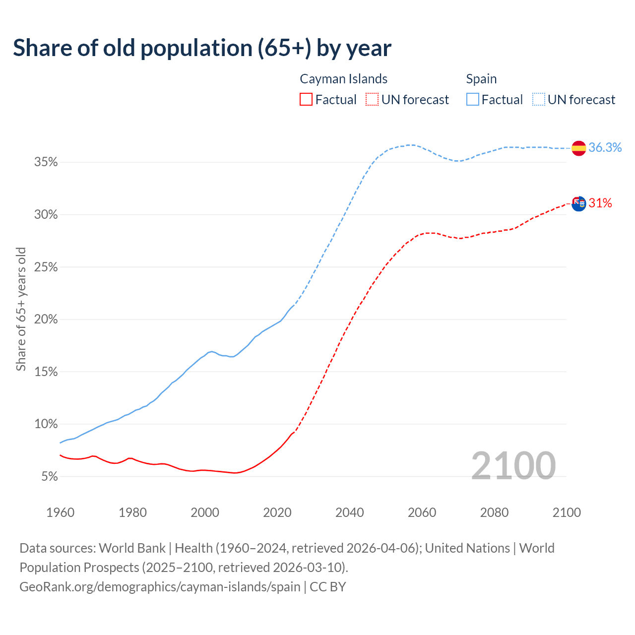The share of older people aged 65 and over is 9% in the Cayman Islands and 21.1% in Spain. Life expectancy in the Cayman Islands compared to Spain .