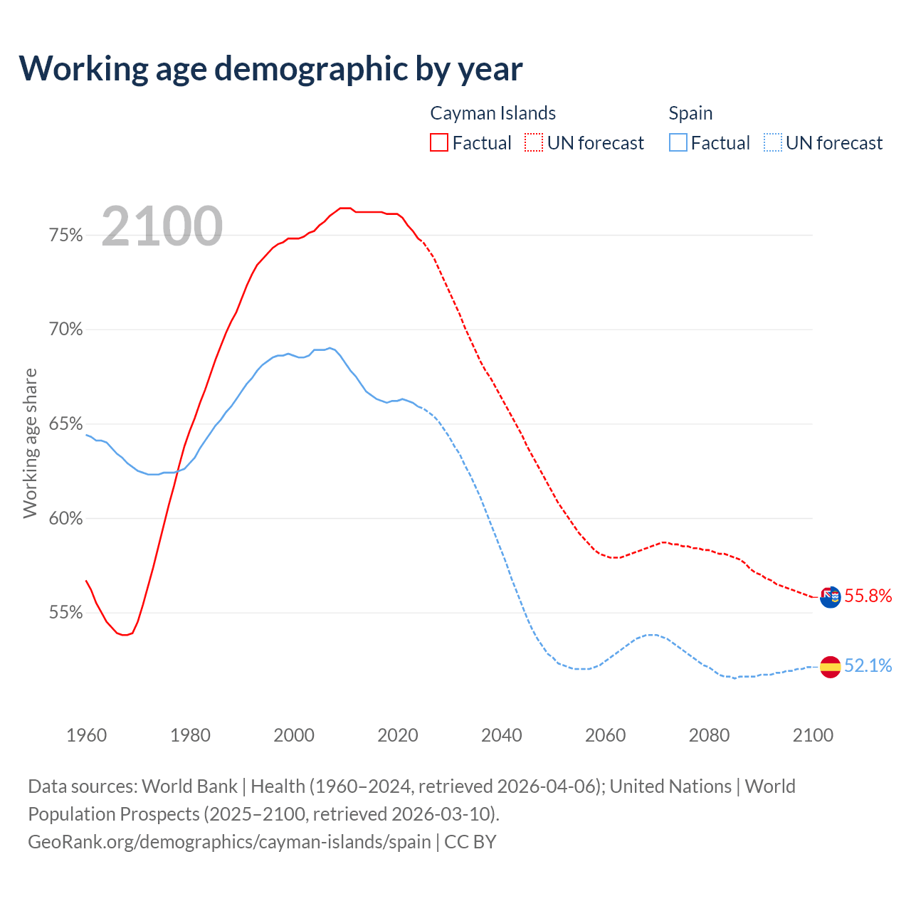 - The Cayman Islands has 58.1K working age adults (aged 15-64) vs 32.2M in Spain.