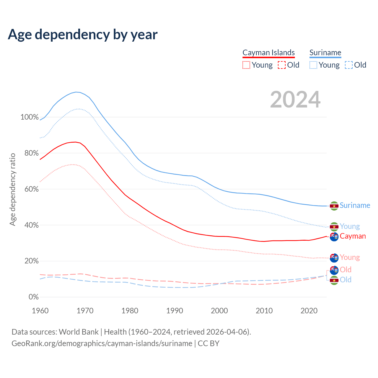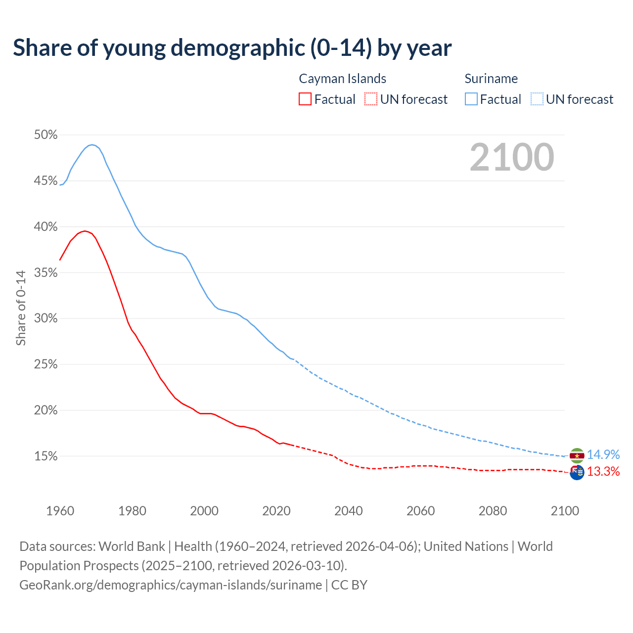 - The share of young demographic (0-15 years old) in the Cayman Islands is 16.2% vs 25.6% in Suriname.