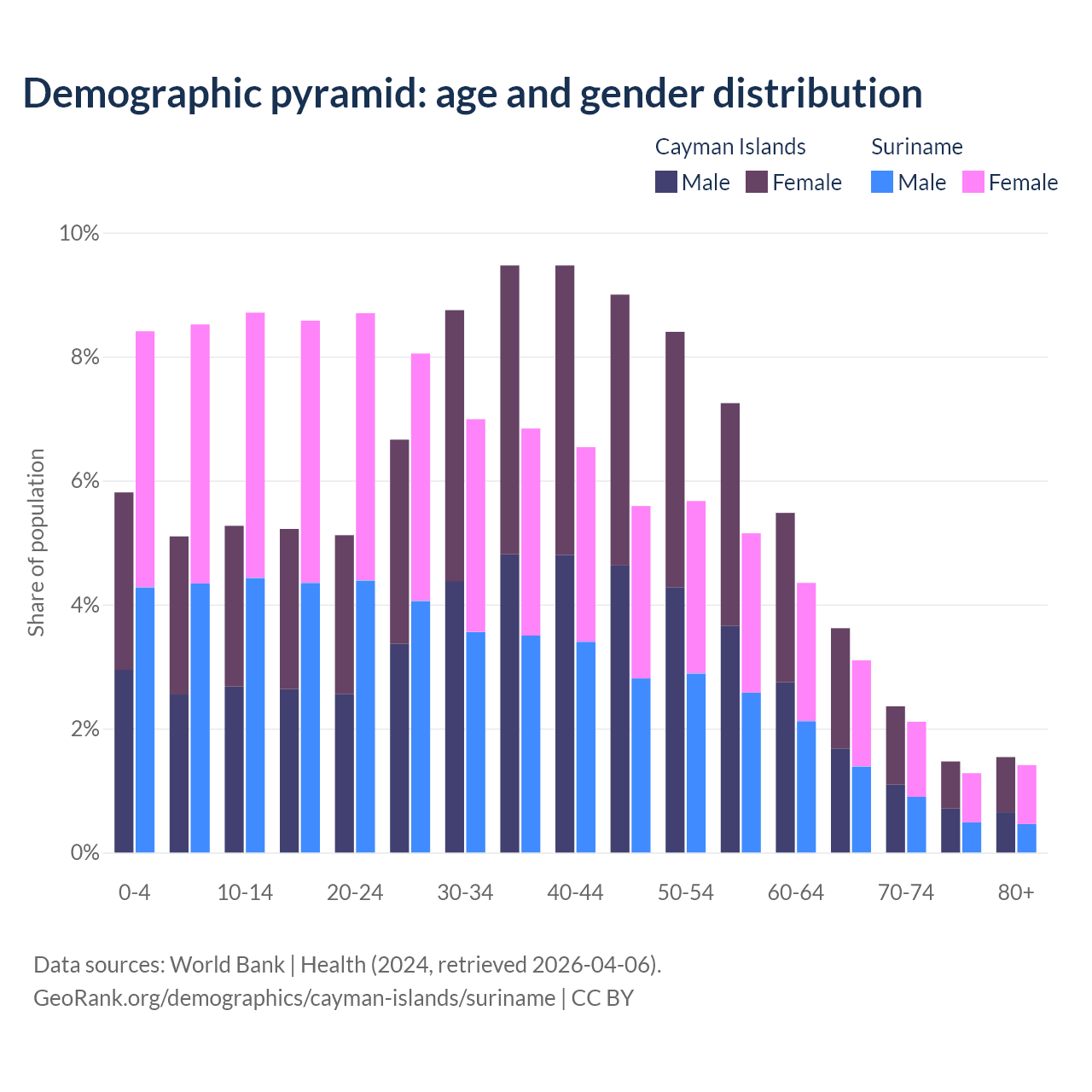 The share of older people aged 65 and over is 9% in the Cayman Islands and 7.9% in Suriname. Life expectancy in the Cayman Islands compared to Suriname .