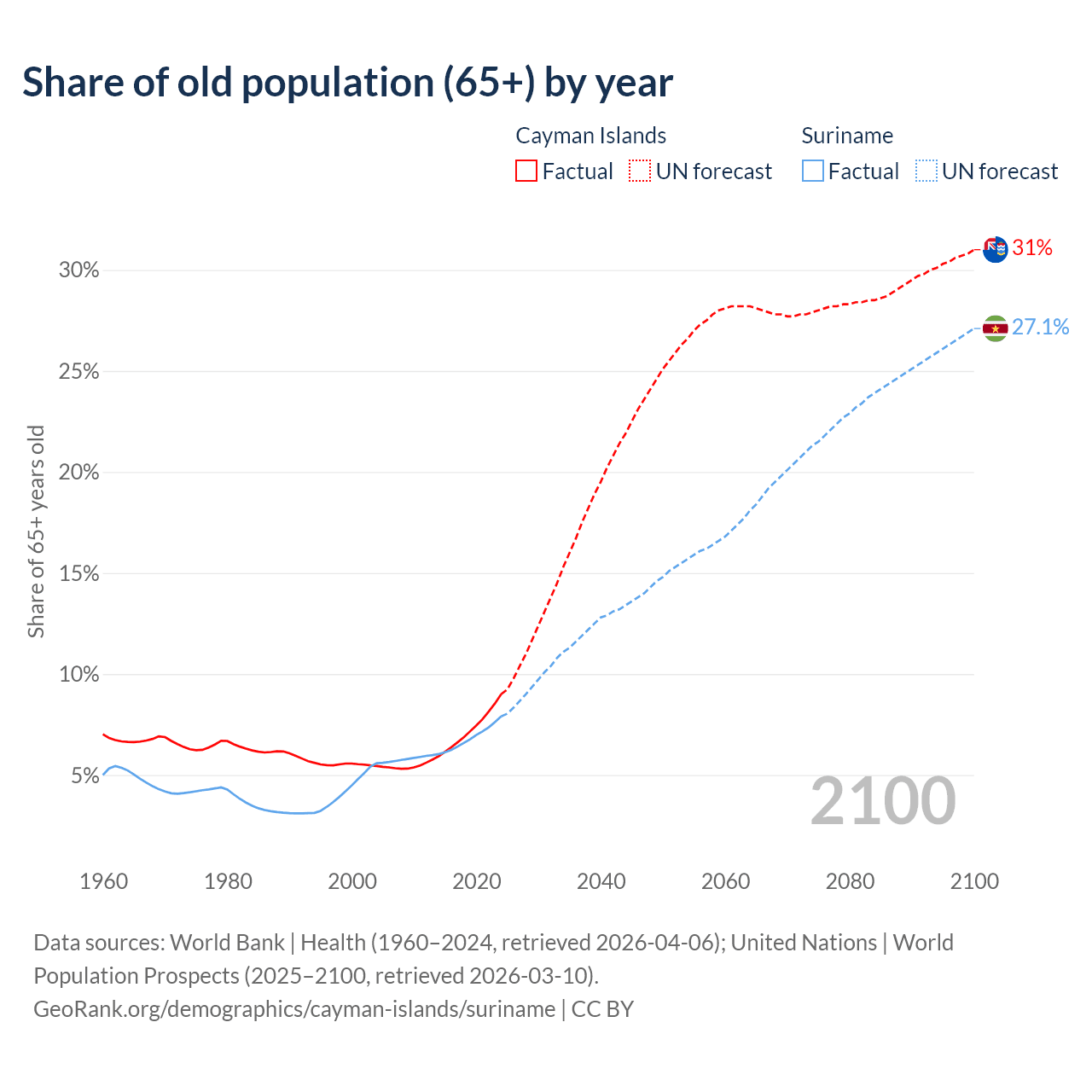 - The share of old-age demographic (65+) in the Cayman Islands is 9% vs 7.9% in Suriname.