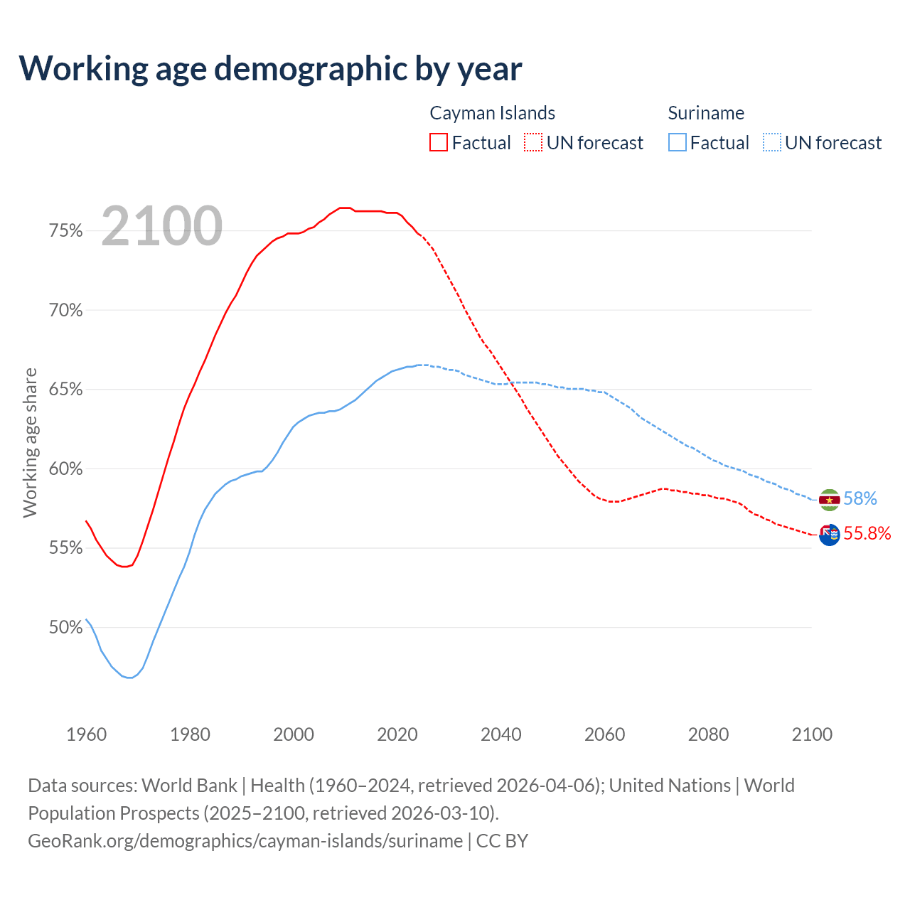 - The Cayman Islands has 58.1K working age adults (aged 15-64) vs 430K in Suriname.