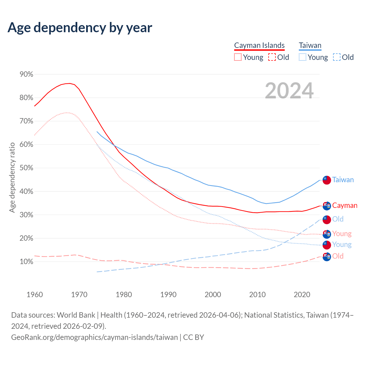 Data sources: World Bank | Health (1960–2024, retrieved 2026-04-06); U.S. Census Bureau (1960–2024, retrieved 2026-02-08); National Statistics, Taiwan (1974–2024, retrieved 2026-02-09).