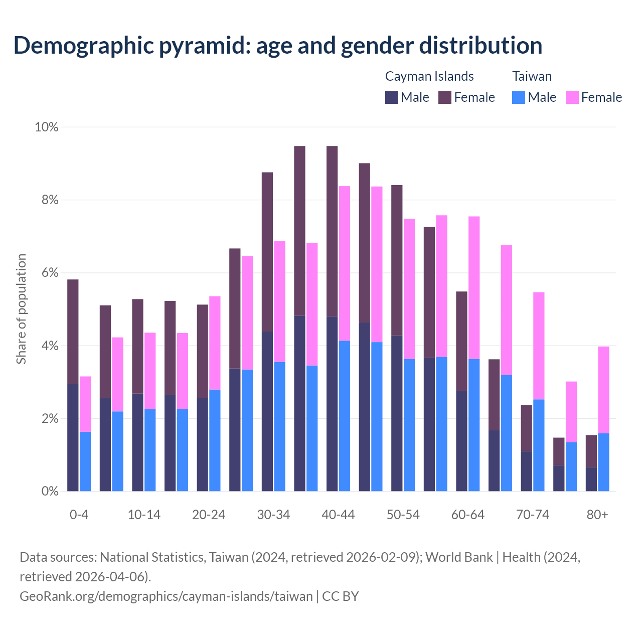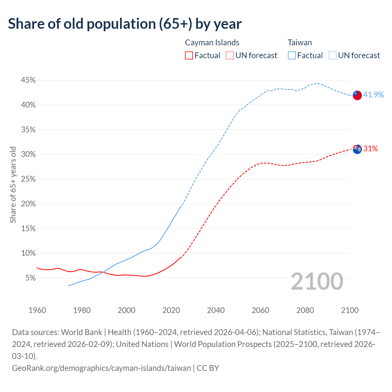 The share of older people aged 65 and over is 9% in the Cayman Islands and 19.2% in Taiwan. Life expectancy in the Cayman Islands compared to Taiwan .