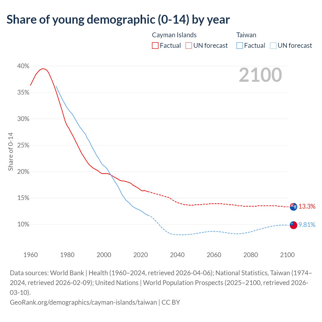 - The share of young demographic (0-15 years old) in the Cayman Islands is 16.2% vs 11.7% in Taiwan.