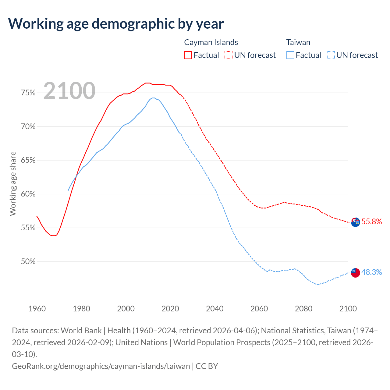 - The Cayman Islands has 58.1K working age adults (aged 15-64) vs 16.1M in Taiwan.