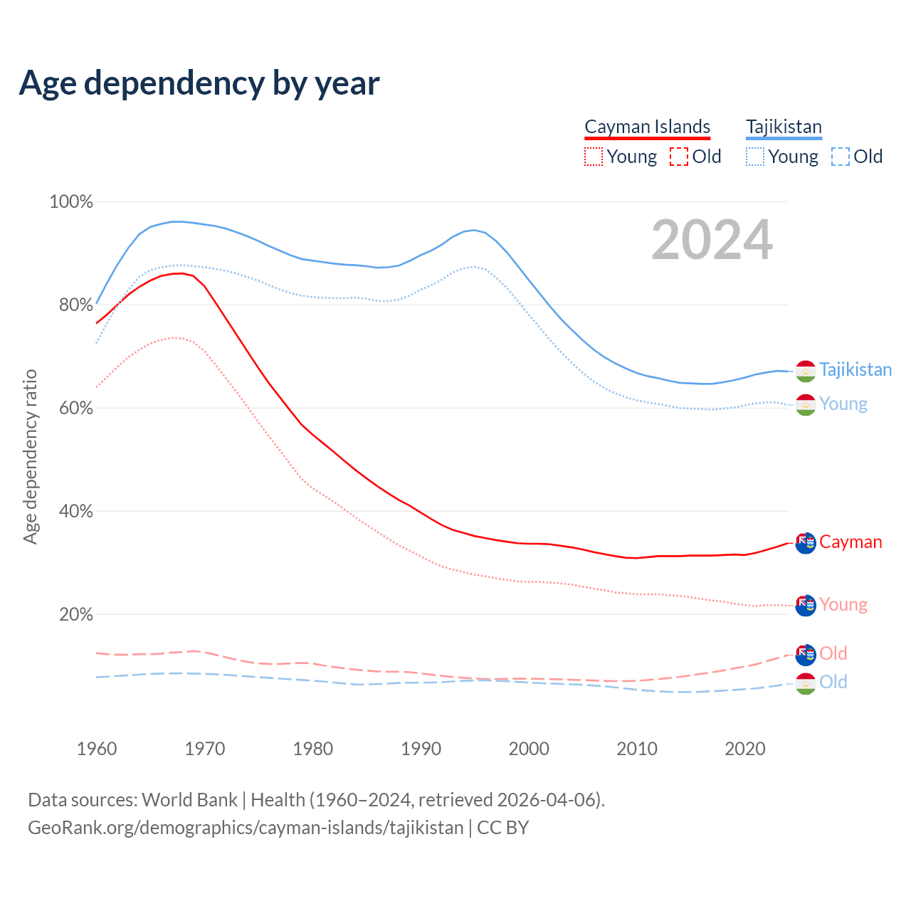 The share of older people aged 65 and over is 9% in the Cayman Islands and 3.85% in Tajikistan. Life expectancy in the Cayman Islands compared to Tajikistan .